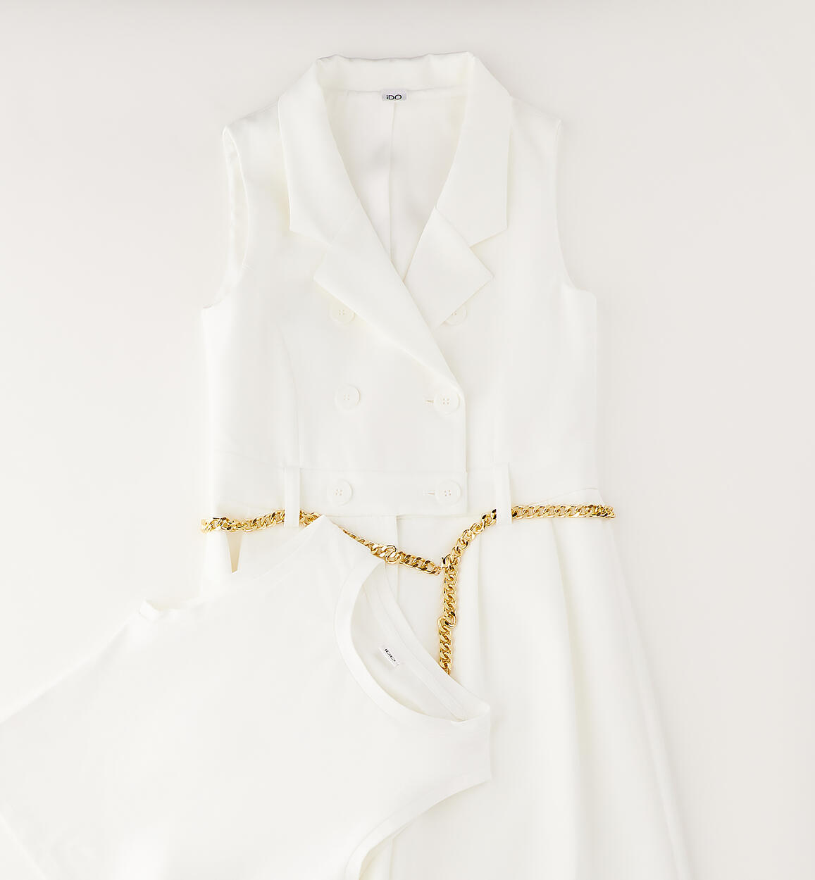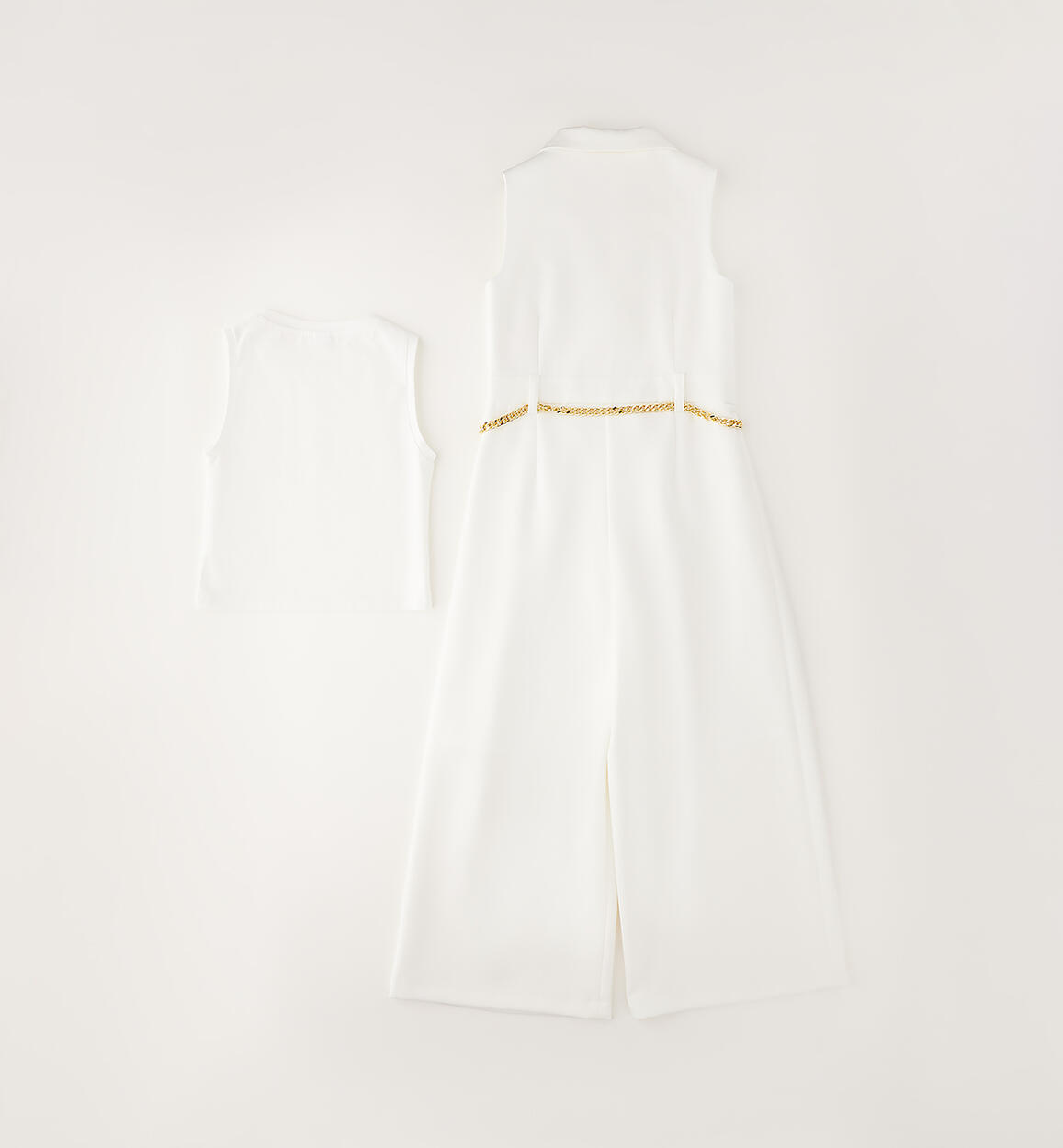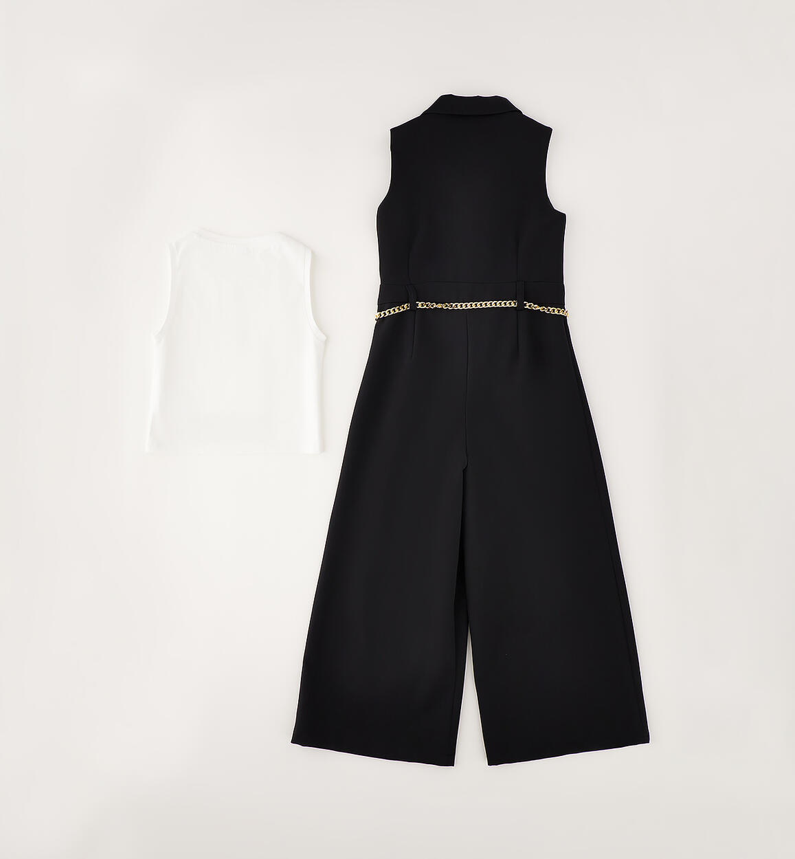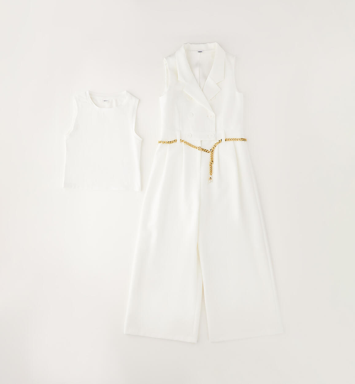 Elegante completo iDO per ragazza composto da canotta e da tuta. La canotta è in jersey stretch di cotone. La tuta è in speciale twill stretch molto elegante, collo a revers, apertura doppiopetto. Cintura in abbinamento