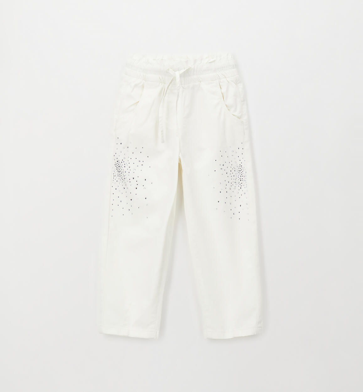 Pantalone lungo per bambina iDO realizzato in twill stretch di cotone con strass e vita arricciata con coulisse. Scegliendo i nostri prodotti in cotone, sostieni l'impegno di iDO nella missione Better Cotton. La fornitura di questo prodotto avviene tramite un sistema di bilancio di massa e potrebbe non contenere Better Cotton. Leggi di più su bettercotton.org/massbalance