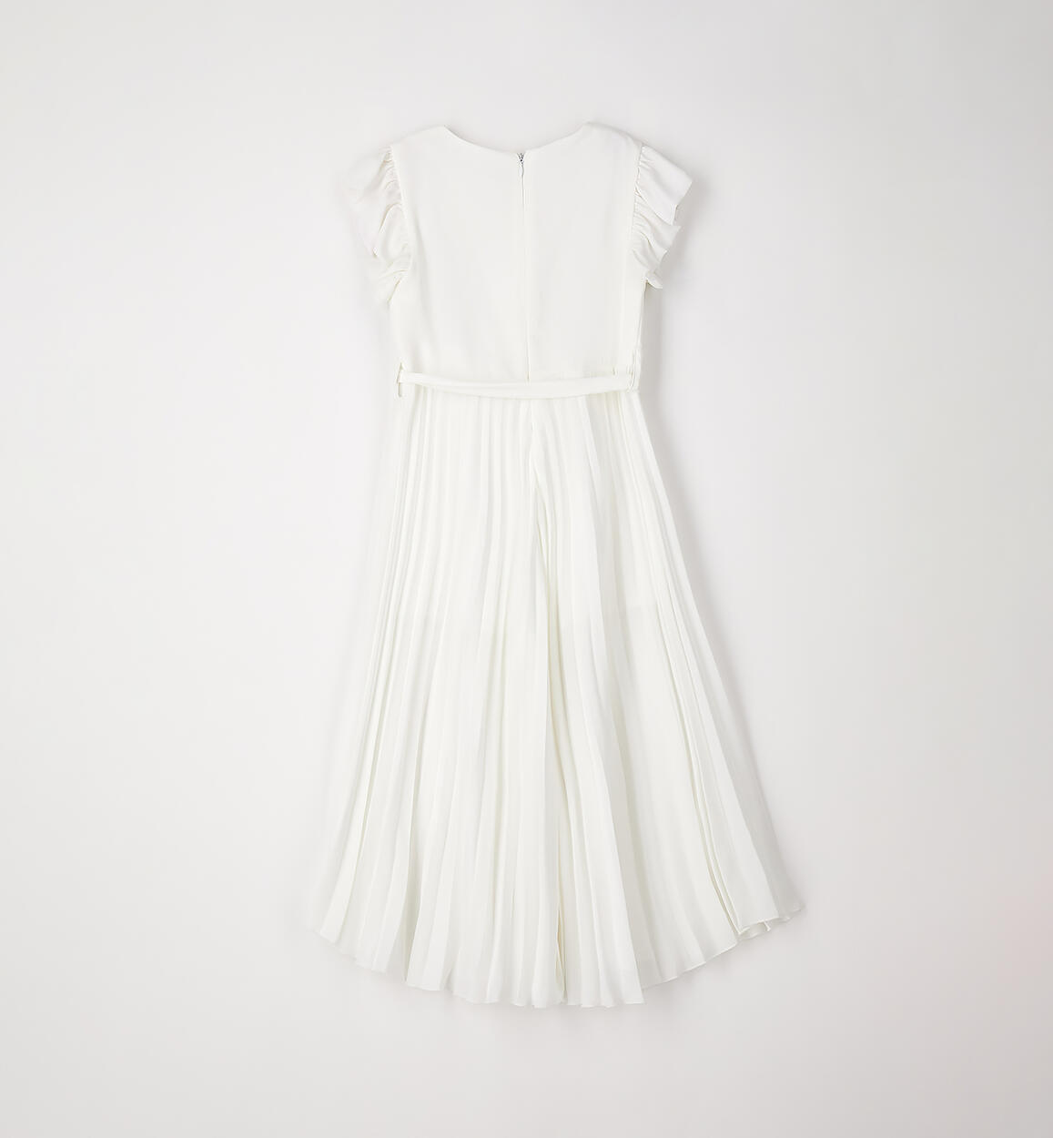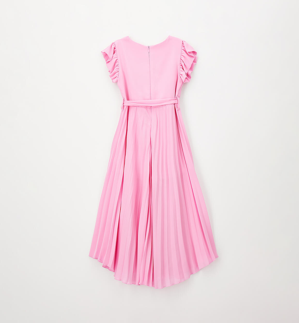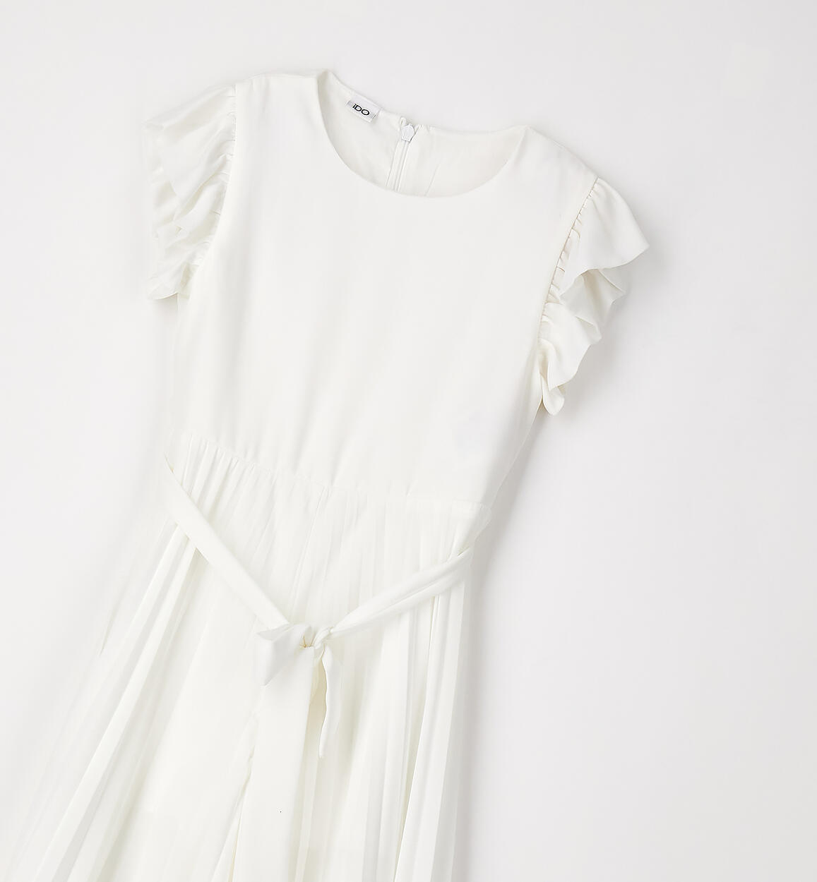 Tuta elegante iDO per bambina realizzata in tessuto crepe. Ruches sulla manica e pantalone plissettato con fodera fino al ginocchio. Cintura in vita. Top foderato in cotone. Apertura sulla schiena con zip invisibile