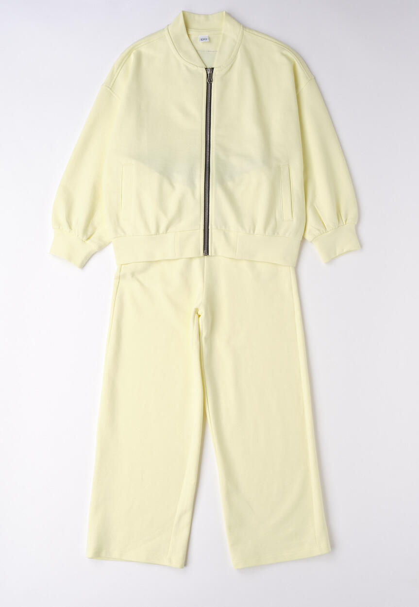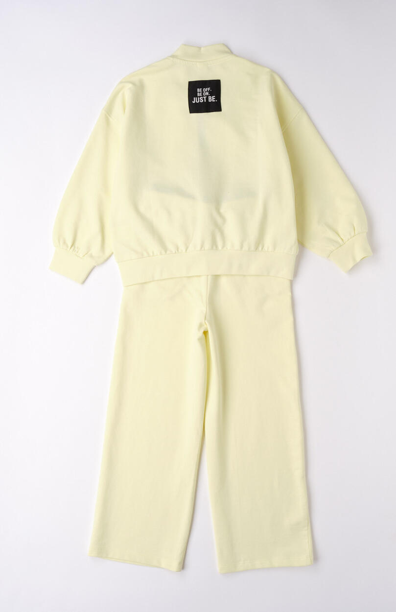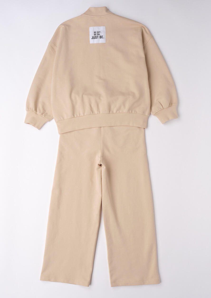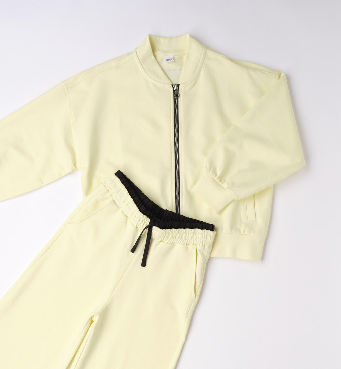 Tuta jogging due pezzi per ragazza iDO realizzata in felpa 100% cotone. Giacchetto con cappuccio e apertura con zip. Pantalone con elastico bicolor in vita e coulisse