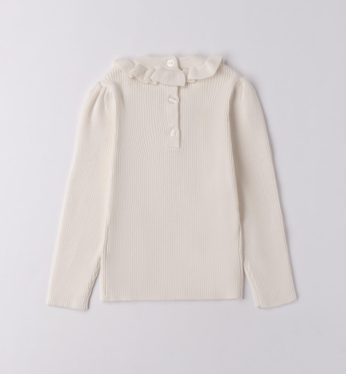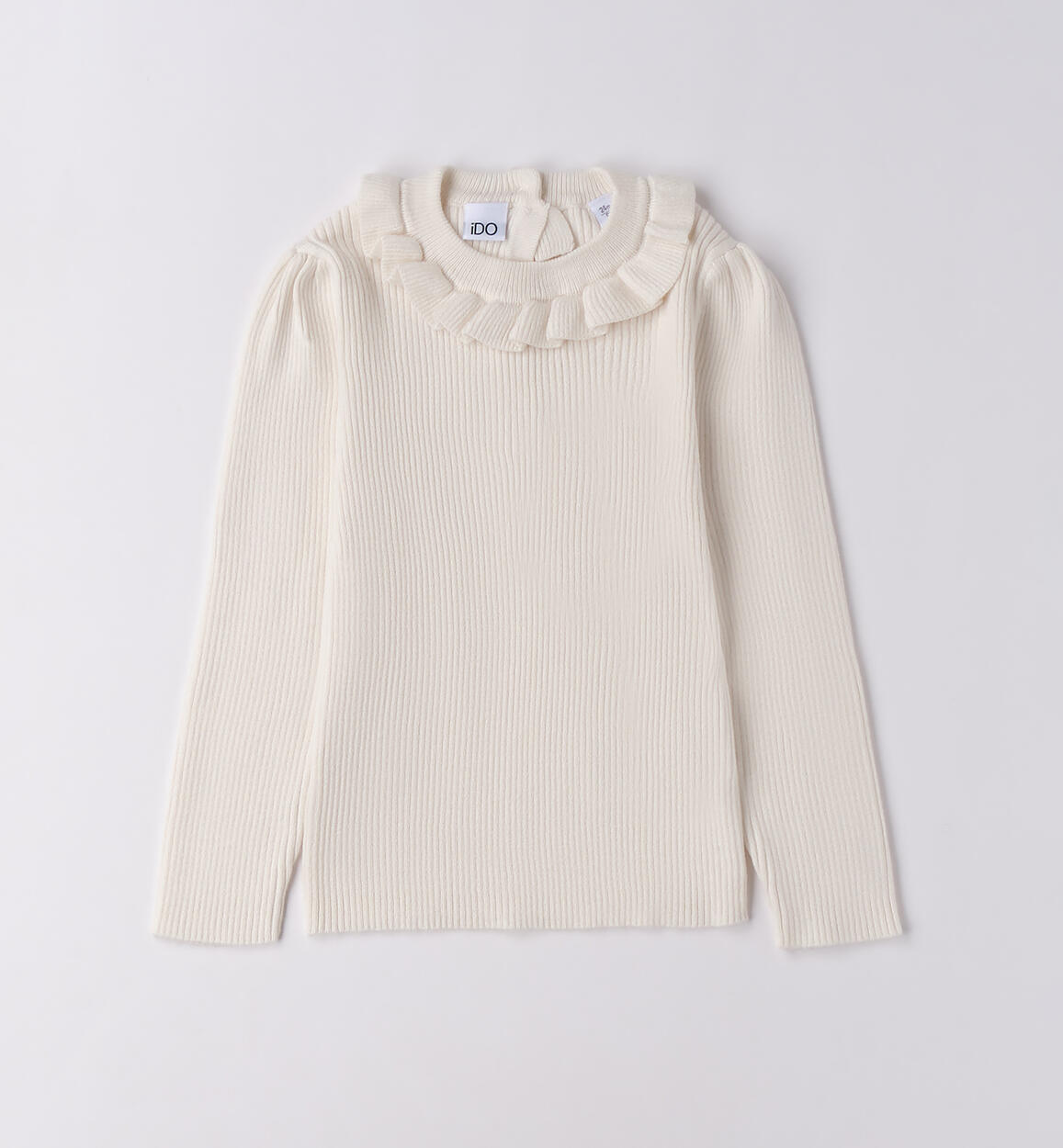 Maglione per bambina iDO 9 mesi - 8 anni realizzato in tricot. Il modello presenta apertura sul retro con bottoni. Il maglioncino è arricchito da colletto con ruches