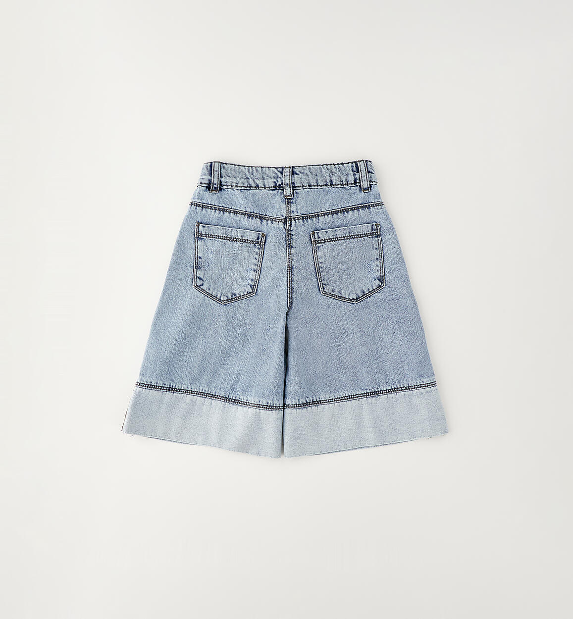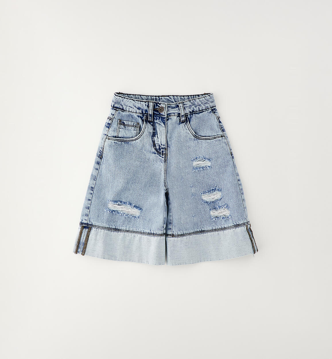 Pantalone corto in morbido denim 100% cotone per ragazza iDO. Modello a vita alta, arricchito da rotture e particolare fondo gamba. Apertura con zip e bottone. Vita regolabile con elastico asolato interno