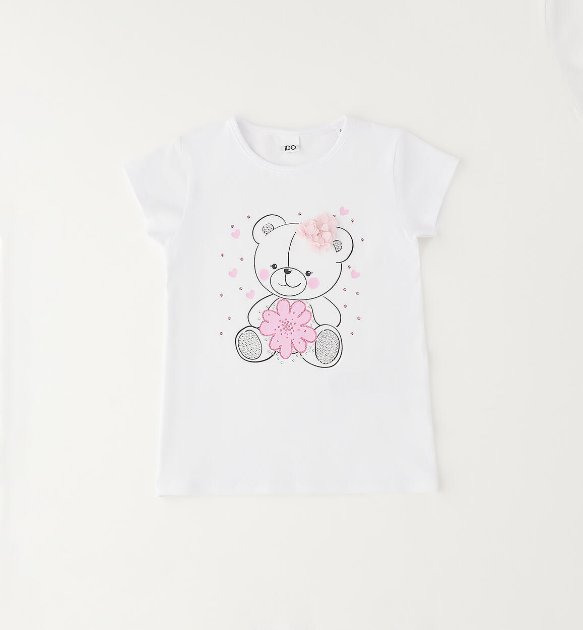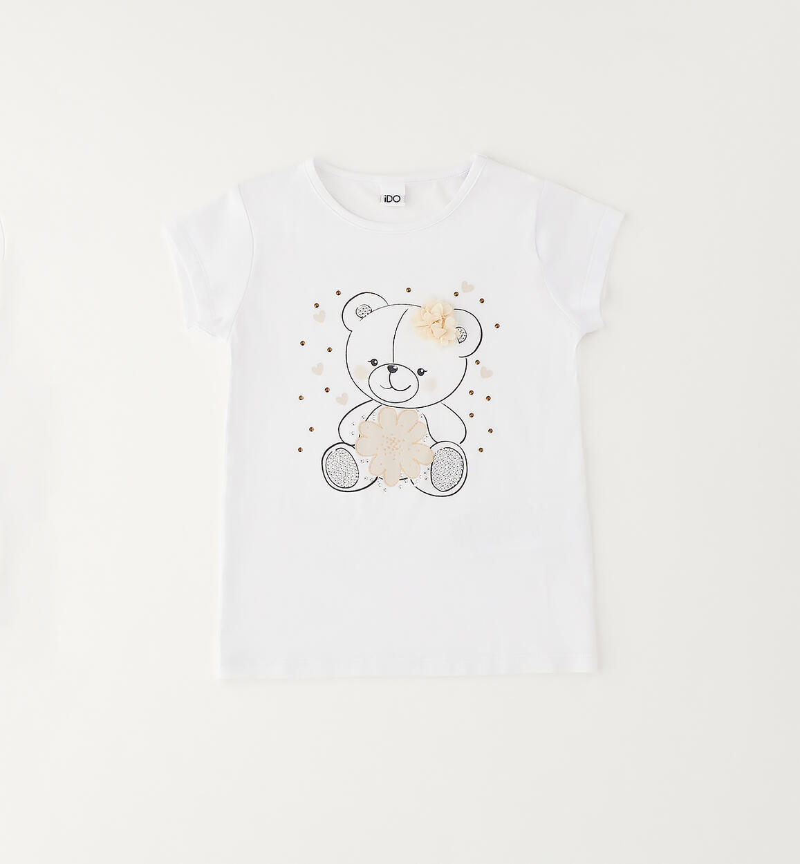 T-shirt per bambina iDO realizzata in jersey stretch con stampa dolce orsetto, dettagli glitter e strass. Fiorellini in chiffon in applicazione. Scegliendo i nostri prodotti in cotone, sostieni l'impegno di iDO nella missione Better Cotton. La fornitura di questo prodotto avviene tramite un sistema di bilancio di massa e potrebbe non contenere Better Cotton. Leggi di più su bettercotton.org/massbalance