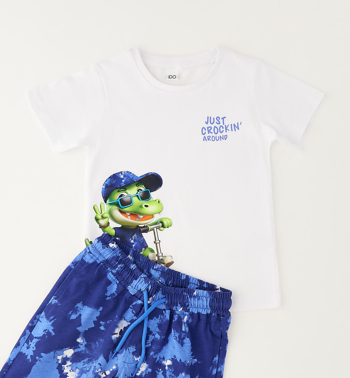 Completo estivo per bambino iDO in jersey 100% cotone. T-shirt con stampa coccodrillo e pantalone corto camouflage con elastico in vita e coulisse. Lunghezza al ginocchio. Scegliendo i nostri prodotti in cotone, sostieni l'impegno di iDO nella missione Better Cotton. La fornitura di questo prodotto avviene tramite un sistema di bilancio di massa e potrebbe non contenere Better Cotton. Leggi di più su bettercotton.org/massbalance