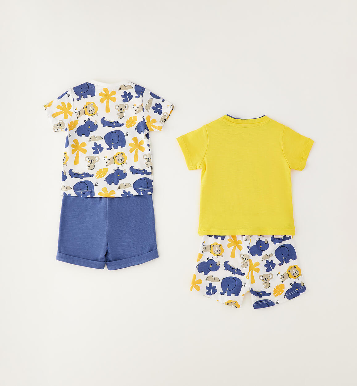 Set due completi iDO per bimbo da 1 a 24 mesi realizzati in jersey 100% cotone. Un completo ha la t-shirt con stampa all over, apertura sulla spalla con bottoni a pressione, pantaloncino corto con tasche davanti e risvoltino sul fondo. L'altro completo ha la t-shirt con applicazioni ricamo, apertura sulla spalla con bottoni a pressione e pantaloncino corto con fantasia all over. Scegliendo i nostri prodotti in cotone, sostieni il nostro investimento nella missione Better Cotton. La fornitura di questo prodotto avviene tramite un sistema di bilancio di massa e potrebbe non contenere Better Cotton. Leggi di più su bettercotton.org/massbalance