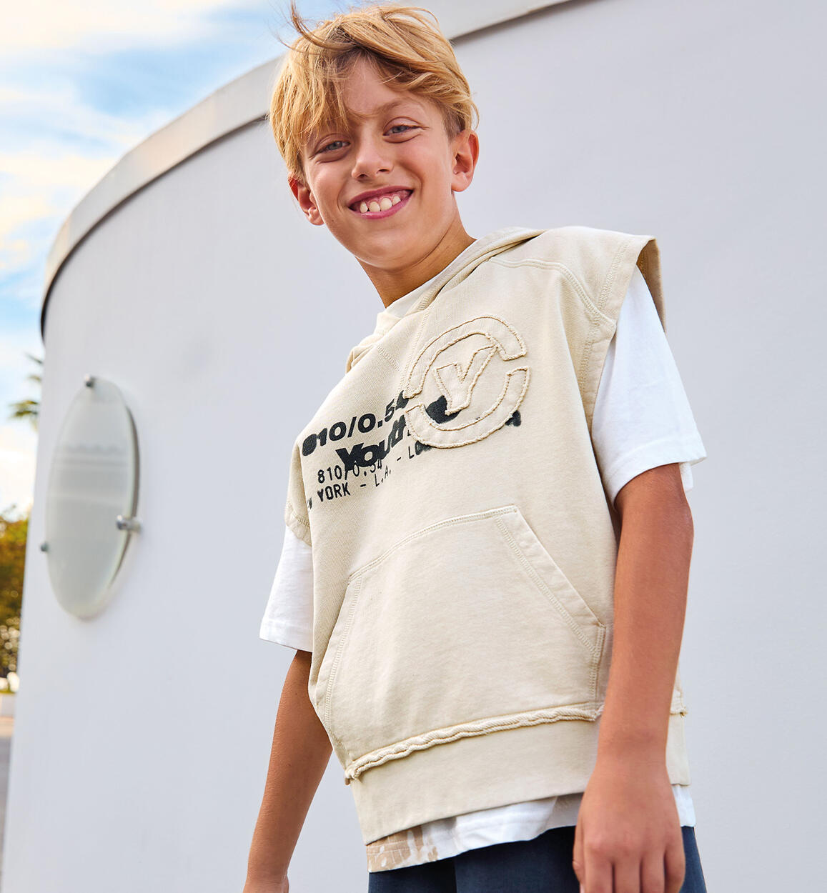 Felpa smanicata per ragazzo iDO realizzata in french terry 100% cotone. Modello con cappuccio, vesibilità over e tasca a marsupio. La felpa è arricchita da stampa e applicazioni ricamo
