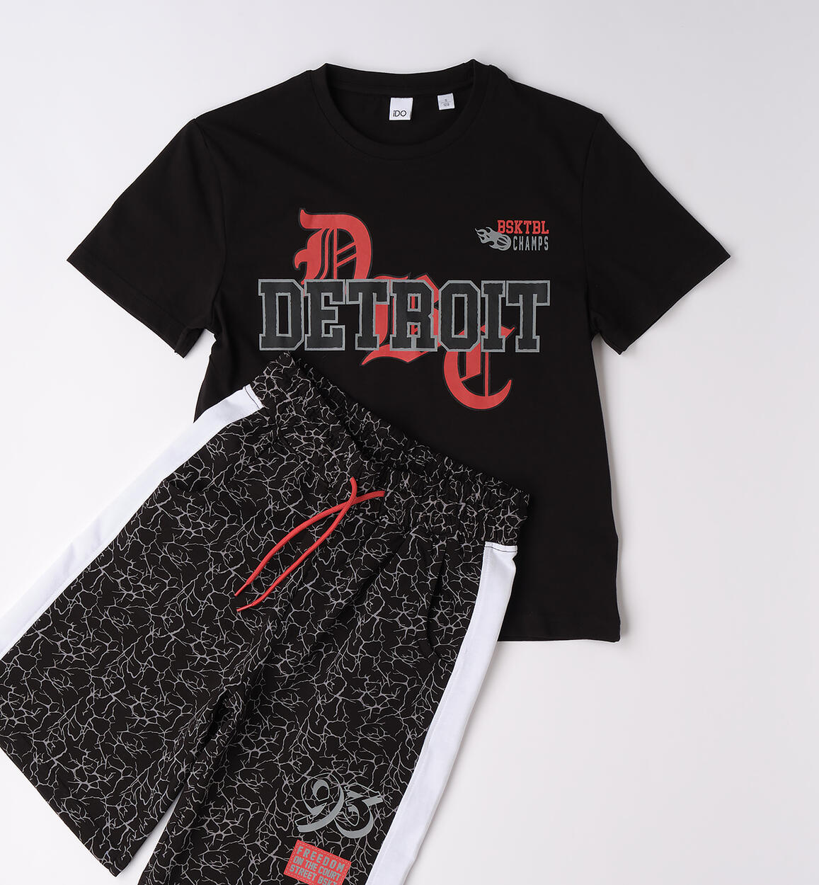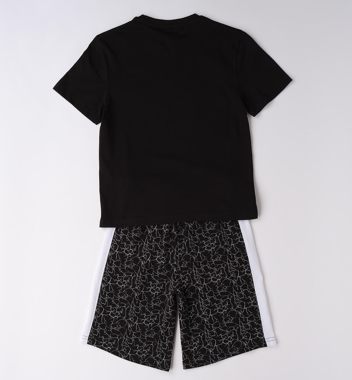 Completo nero per ragazzo iDO realizzato in 100% cotone. T-shirt over in jersey con stampa tema basket. Pantaloncino con elastico in vita e coulisse. Modello basket. Elastico in vita e coulisse. Oversize fit