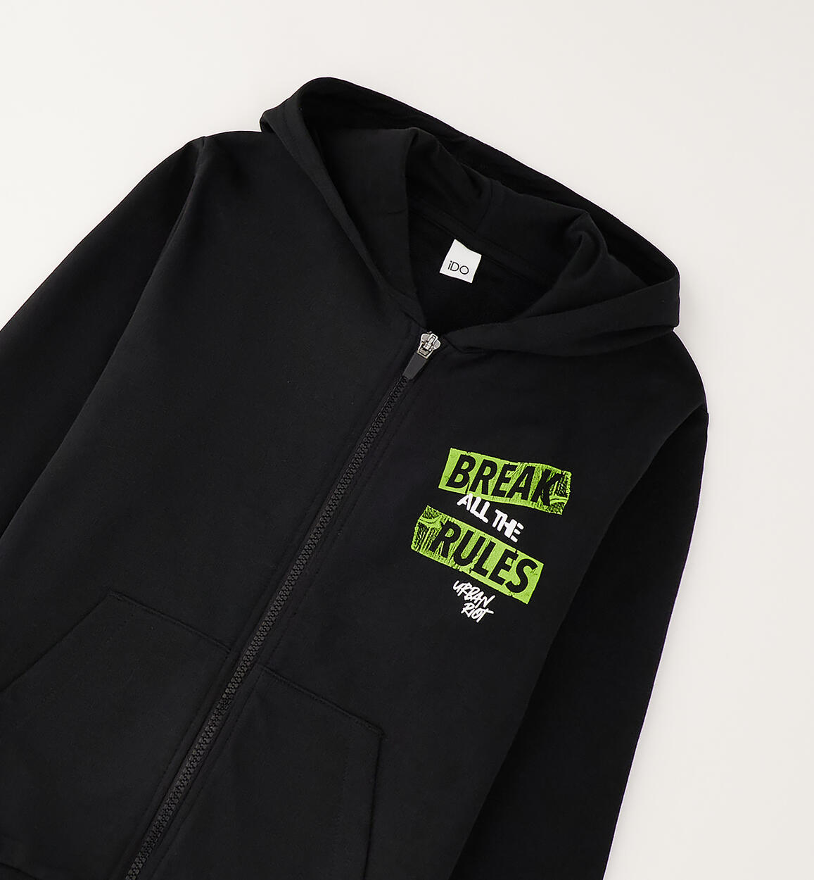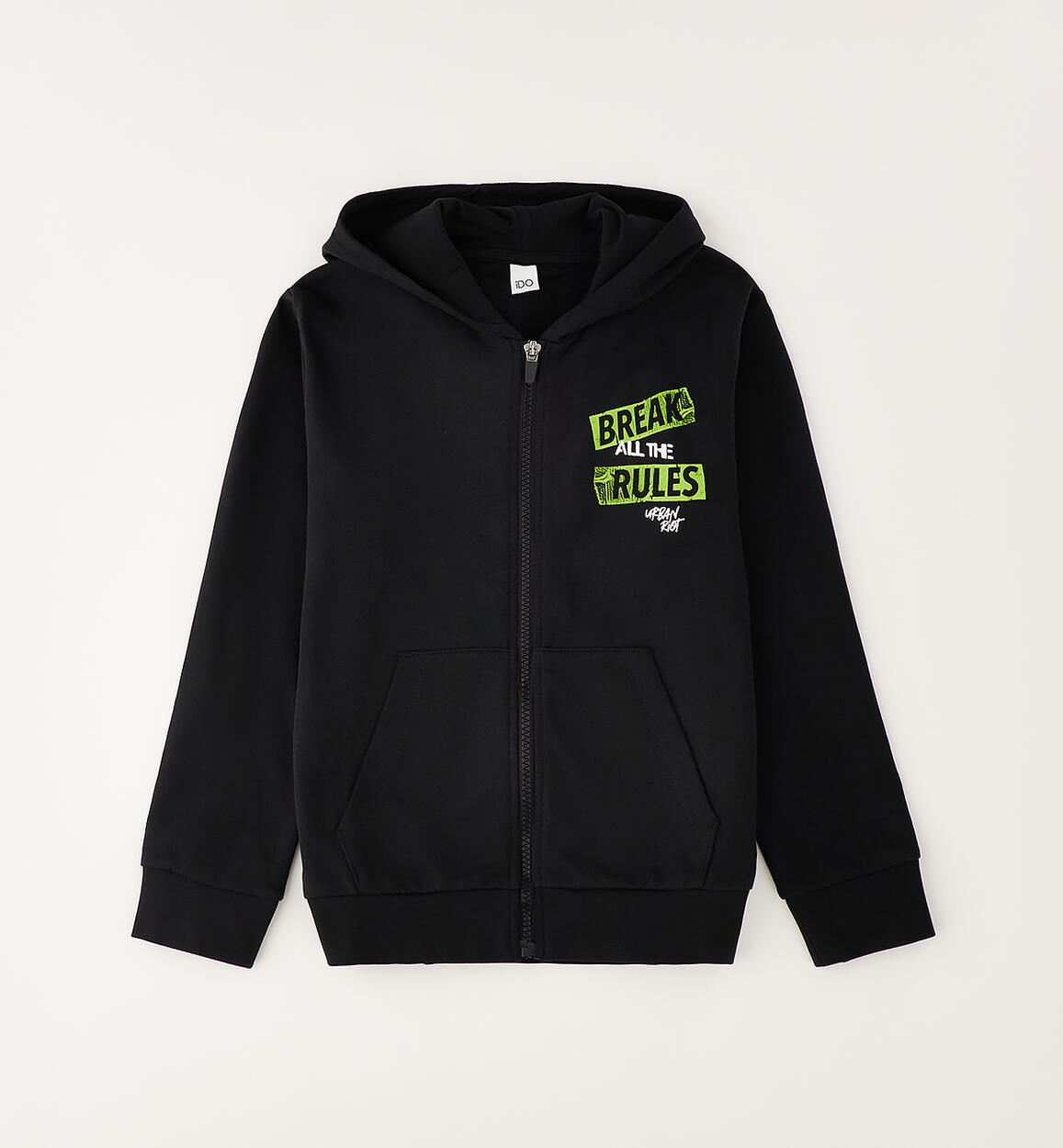 Felpa per ragazzo iDO realizzata in felpa leggera 100% cotone. Modello con cappuccio, tasche e stampa. Apertura con zip