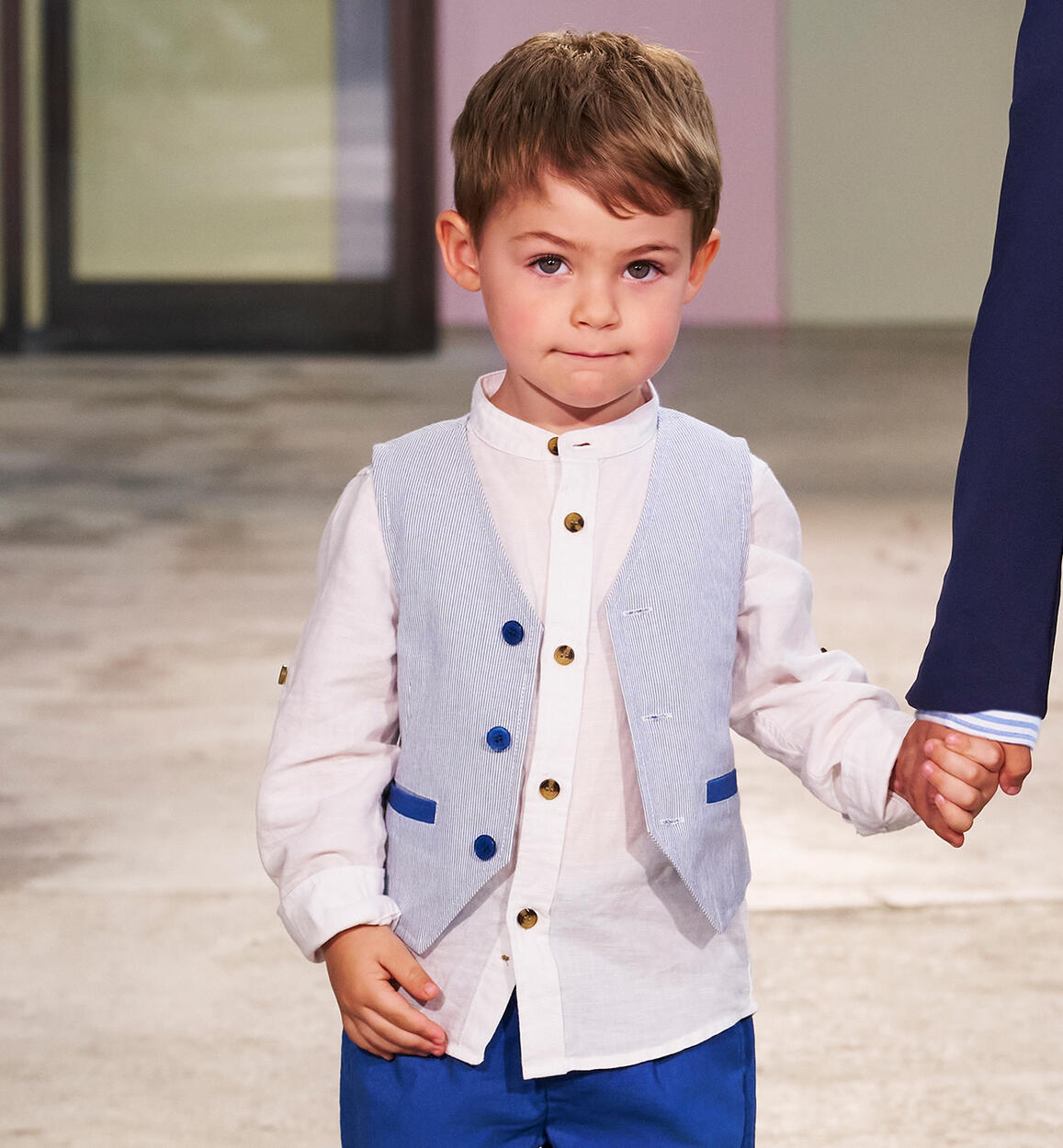 Gilet elegante dalla fantasia rigata con taschini e apertura con bottoni. Fodera in popeline. Martingala dietro