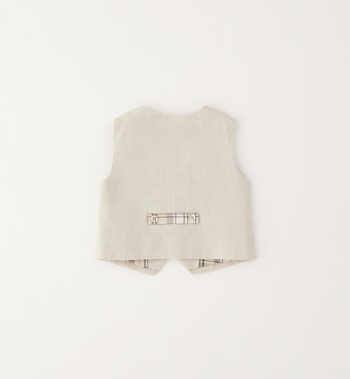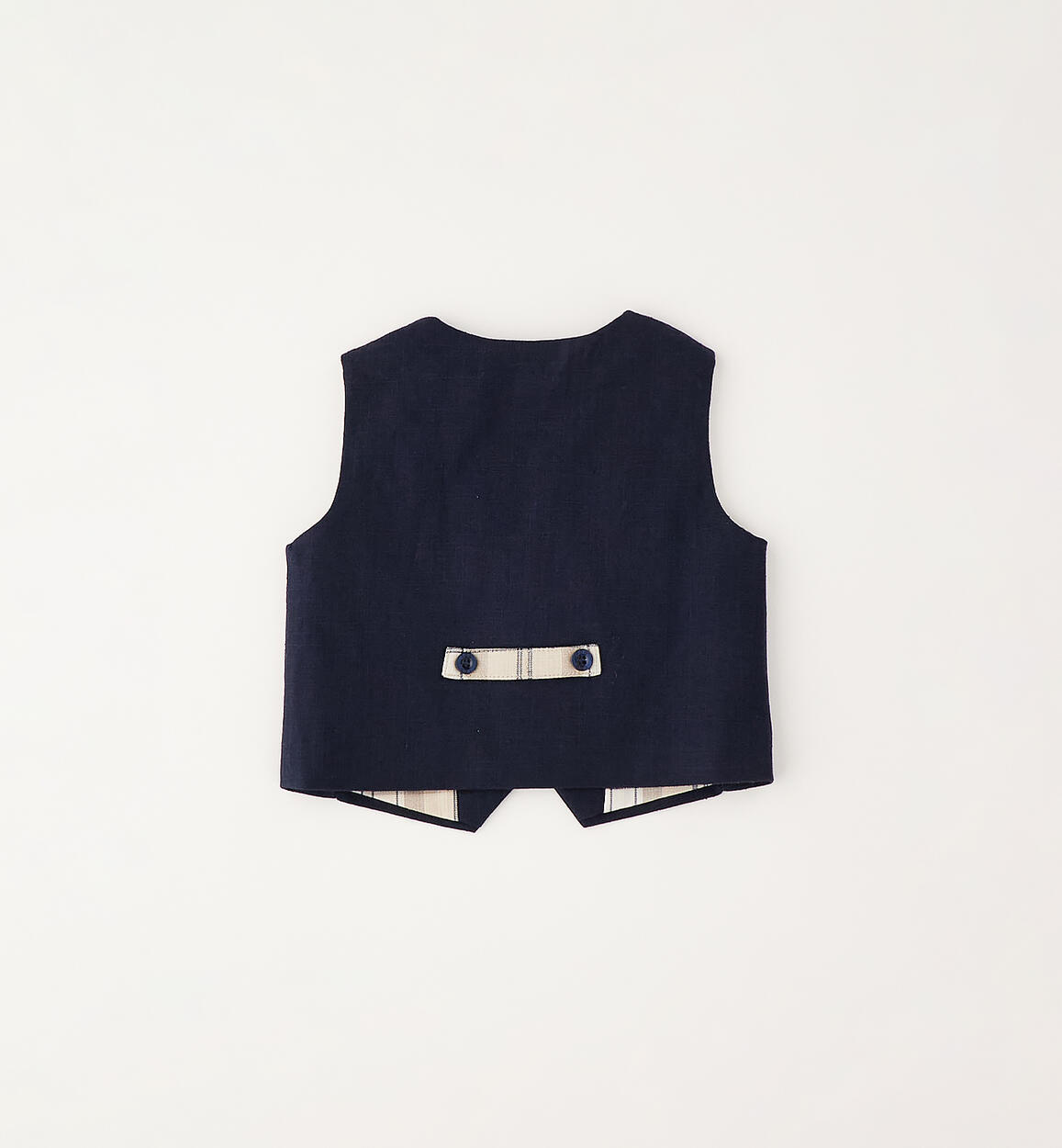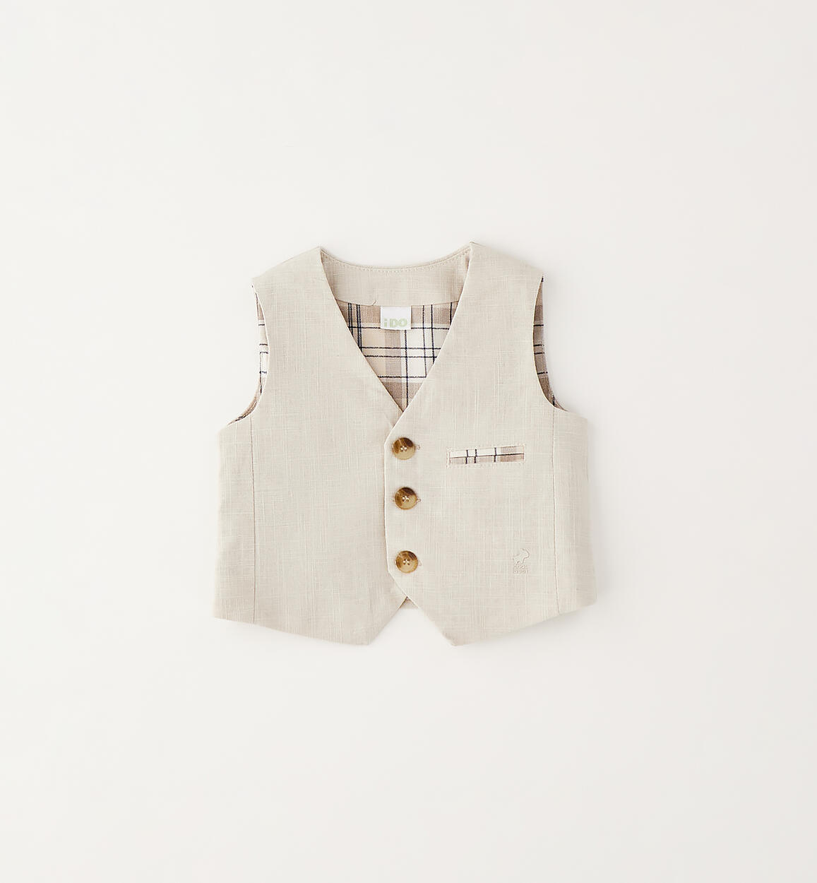 Elegante gilet iDO per bimbo da 1 a 24 mesi realizzato in lino e cotone stretch con apertura tramite bottoni e finto taschino. Fodera dalla fantasia check. Martingala dietro