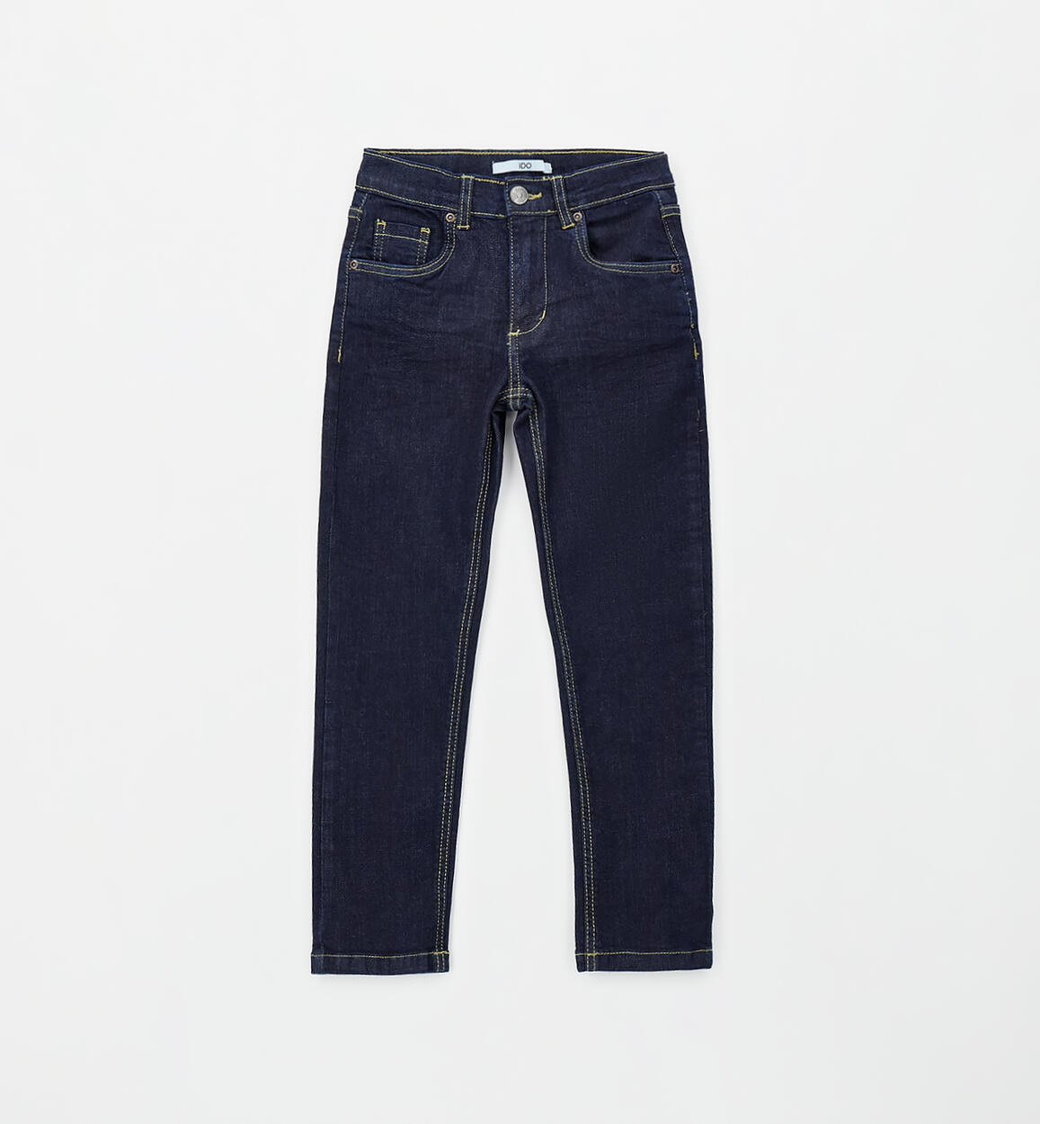 Pantalone lungo in denim stretch di cotone per ragazzo iDO. Apertura con zip e bottone. Vita regolabile con elastico asolato interno. Regular fit