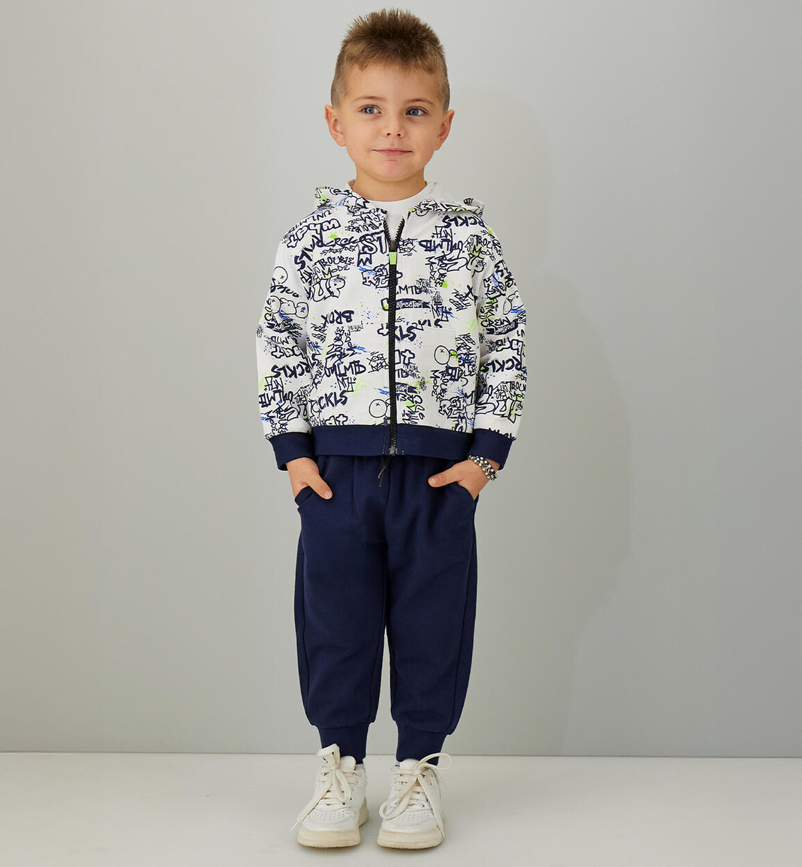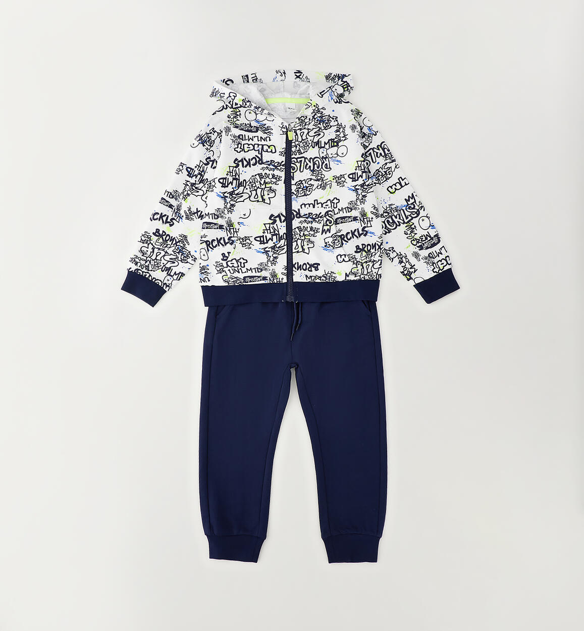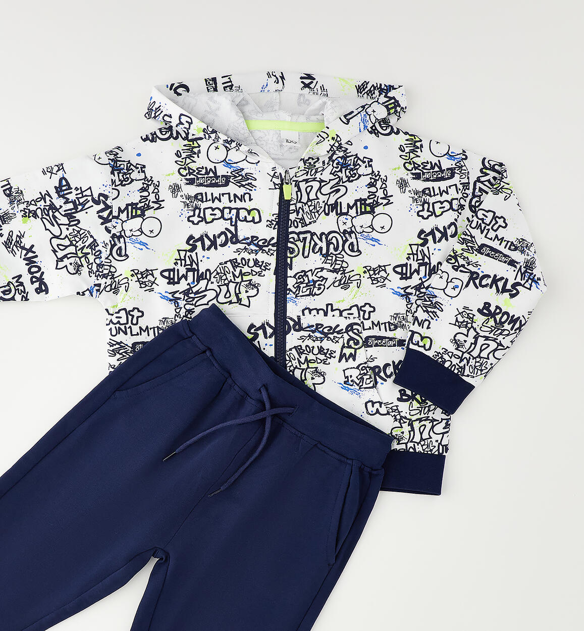 Tuta jogging due pezzi per bambino iDO realizzata in felpa leggera 100% cotone. Giacchetto con stampa all over, apertura con zip e cappuccio. Pantalone con elastico in vita e coulisse. Tuta con vestibilità over. Scegliendo i nostri prodotti in cotone, sostieni l'impegno di iDO nella missione Better Cotton. La fornitura di questo prodotto avviene tramite un sistema di bilancio di massa e potrebbe non contenere Better Cotton. Leggi di più su bettercotton.org/massbalance