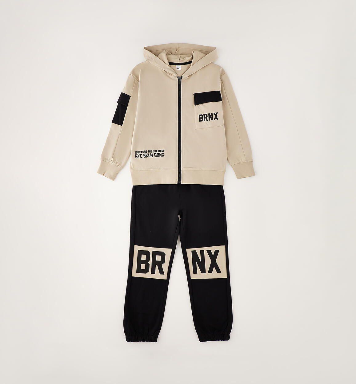 Tuta jogging due pezzi per ragazzo iDO realizzata in felpa 100% cotone con stampe. Vestibilità over. Giacchetto con cappuccio e apertura con zip. Pantalone con elastico in vita e coulisse
