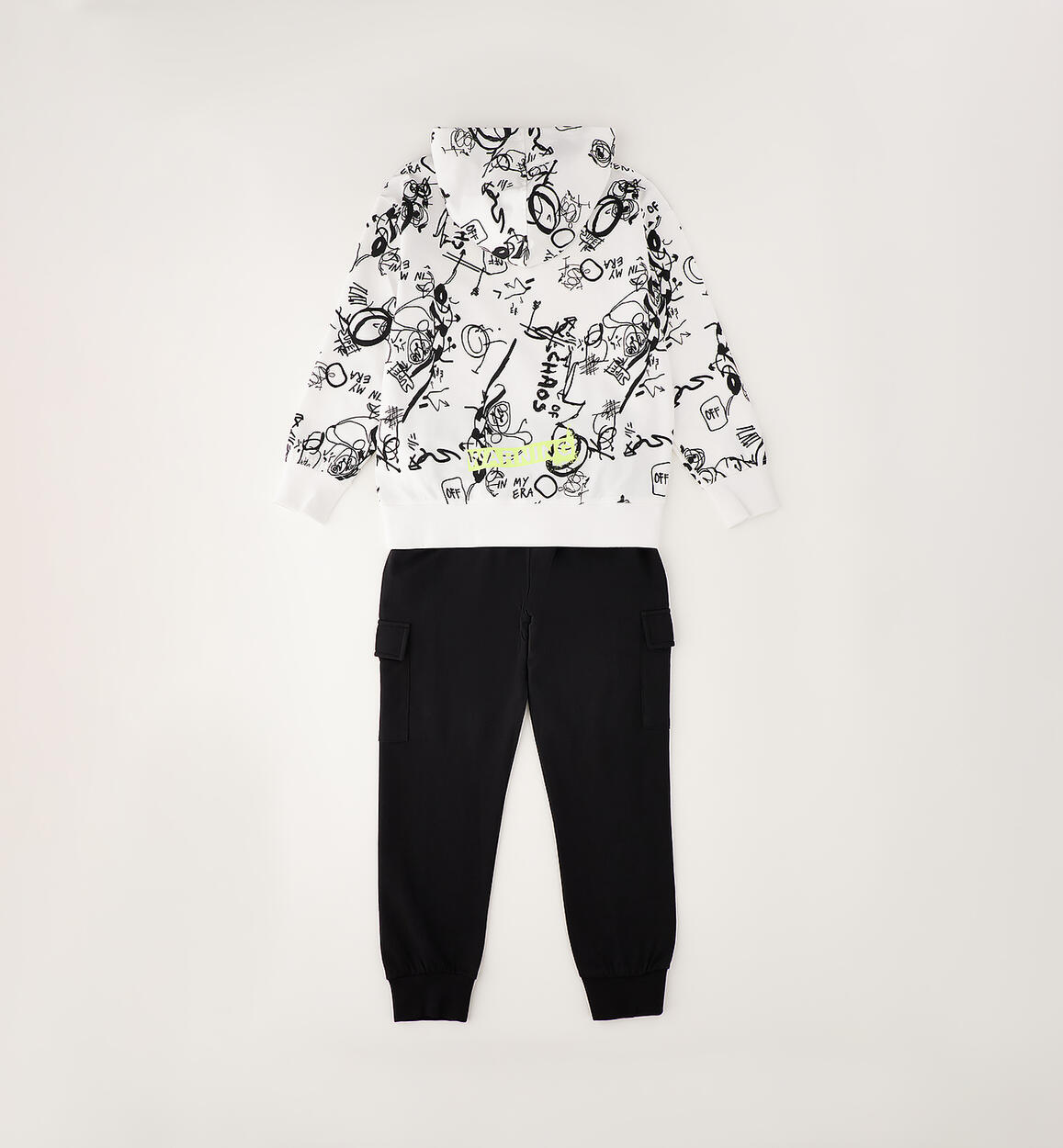 Tuta jogging due pezzi per ragazzo iDO realizzata in felpa leggera 100% cotone. Modello con cappuccio, tasca a marsupio e stampe. Pantalone con tasconi laterali ed elastico in vita con coulisse. Vestibilità over