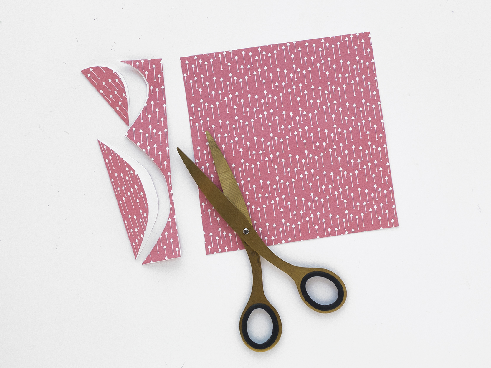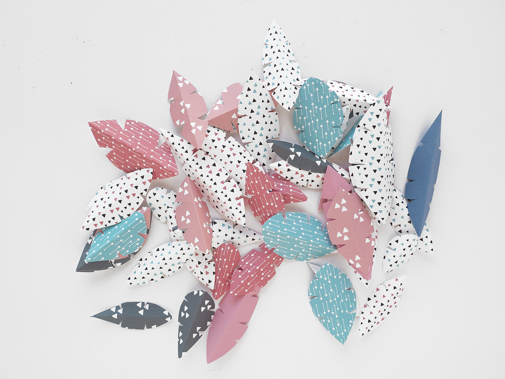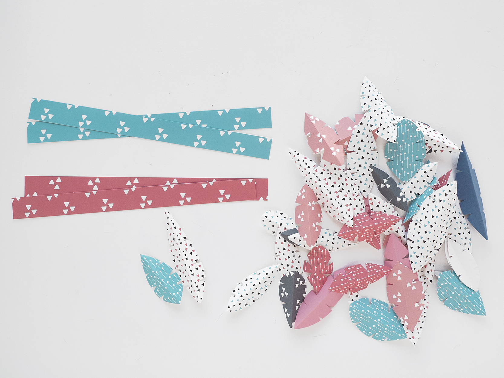 Ritagliate per ogni fantasia delle strisce larghe circa 3 cm, piegate a metà per il lato più lungo e mantenendo la piega verso l’interno, ritagliate la sagoma di una piuma.