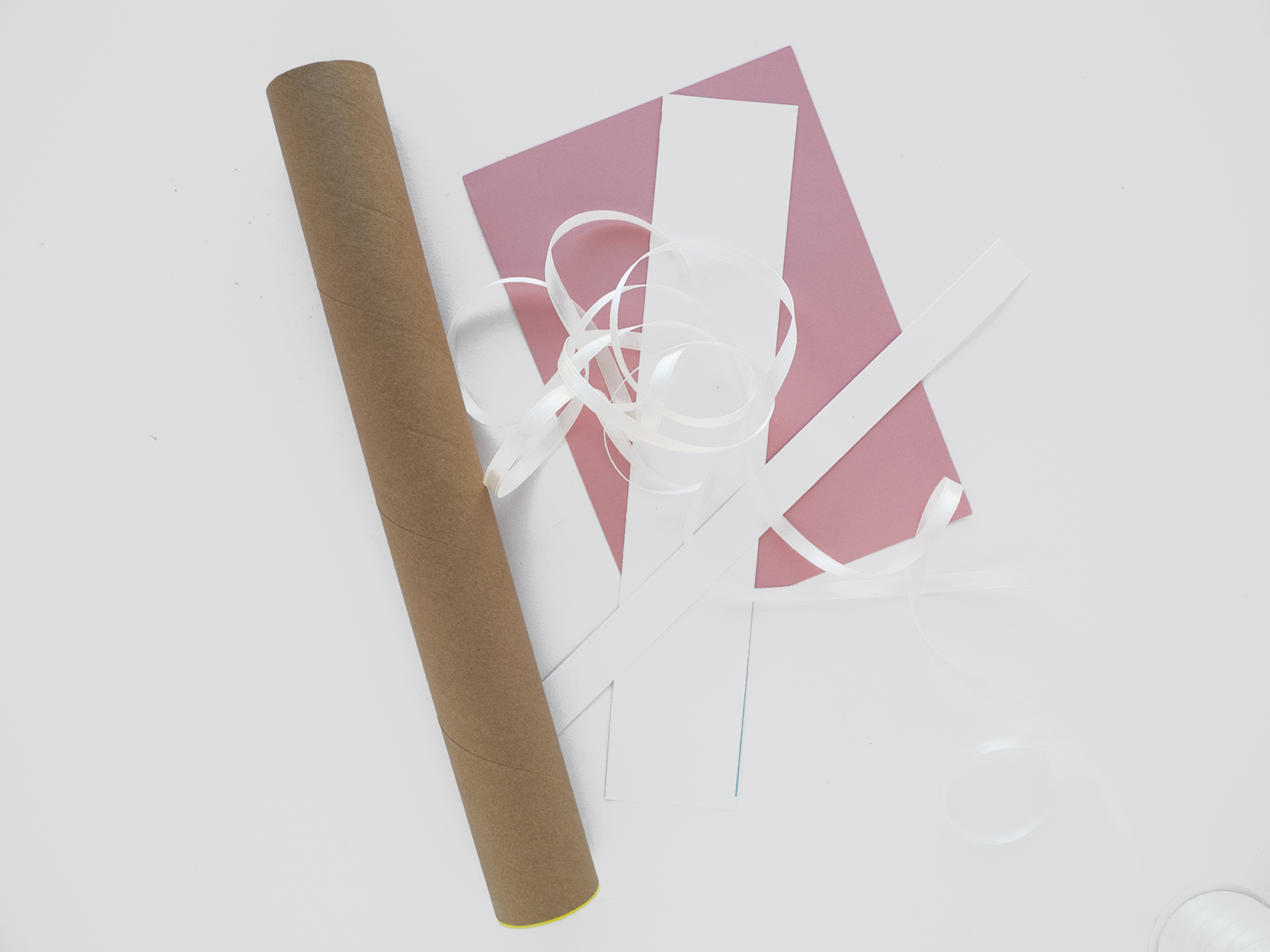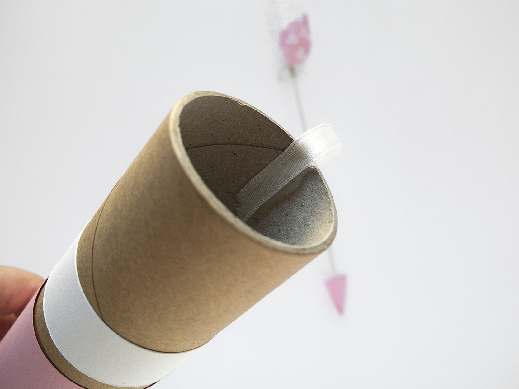 Con un pò di colla a caldo incollate il nastro all’interno del tubo di cartone. Fermate l’altra estremità del nastro con il tappo di chiusura del tubo.