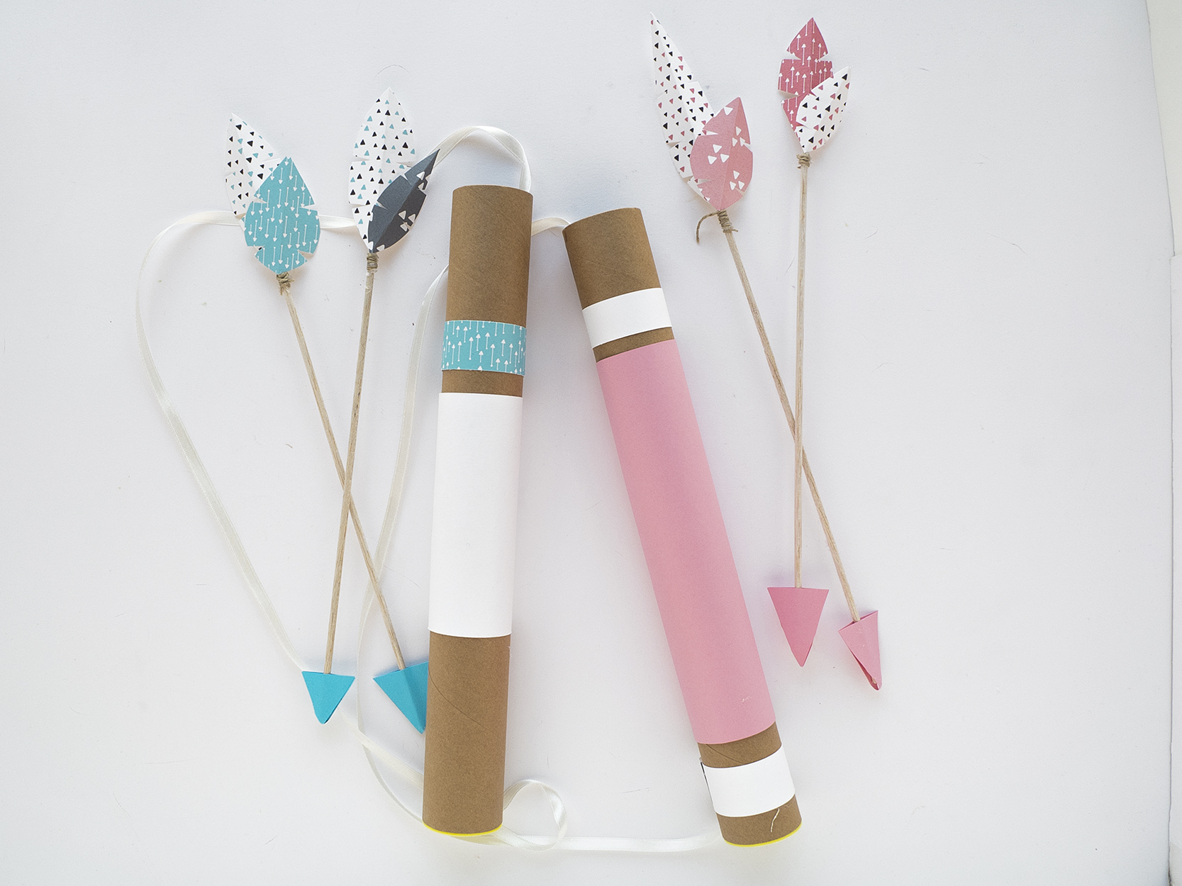 Decorate l’esterno del tubo con delle fascette di carta colorata. Per realizzare l’arco chiedete ai bimbi di cercare una bastone di legno e poi legate alle due