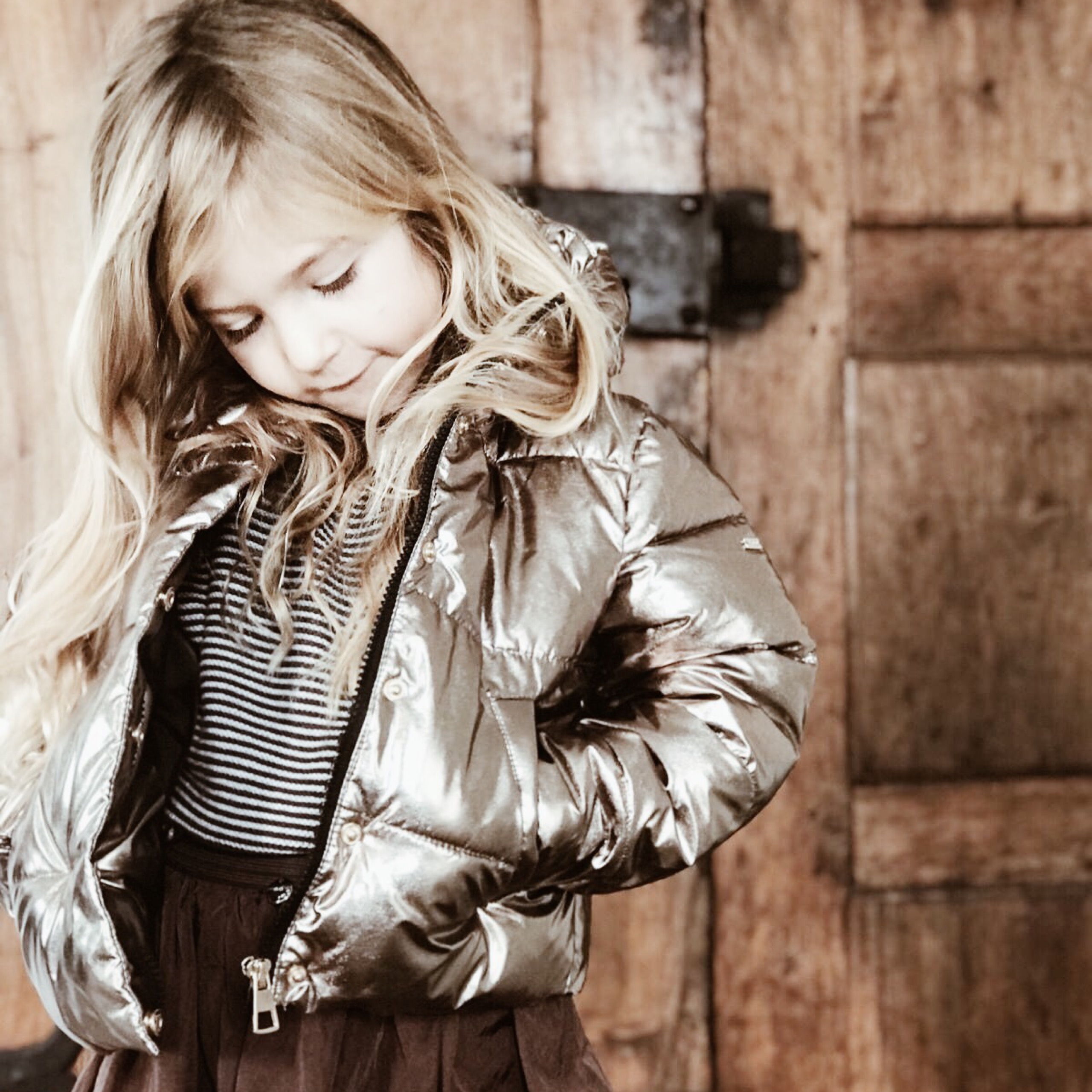 Non sono riuscita a resistere al piumino dorato cangiante con il cappuccio e allo scaldacollo in ecopelliccia marrone e grigio per la mia bimba.