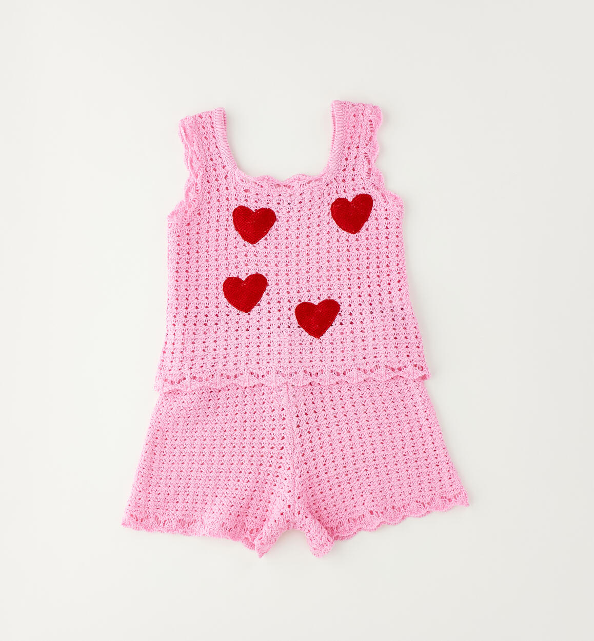 Completo in tricot per bambina iDO con cuori, composto da canotta e pantaloncino corto, 100% cotone. Scegliendo i nostri prodotti in cotone, sostieni l'impegno di iDO nella missione Better Cotton. La fornitura di questo prodotto avviene tramite un sistema di bilancio di massa e potrebbe non contenere Better Cotton. Leggi di più su bettercotton.org/massbalance