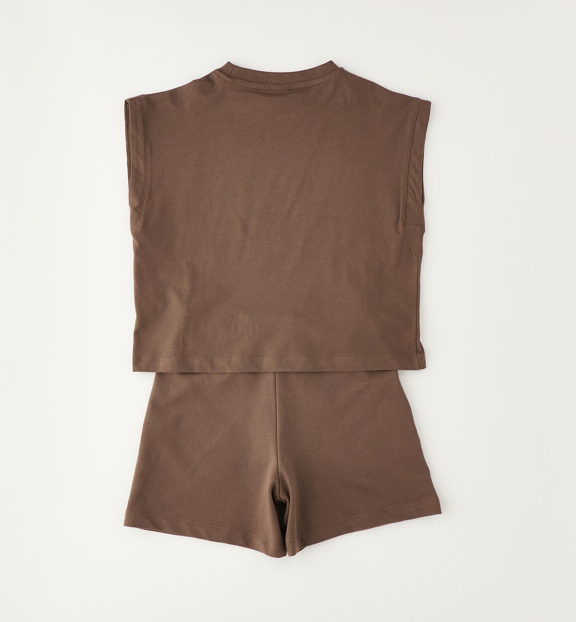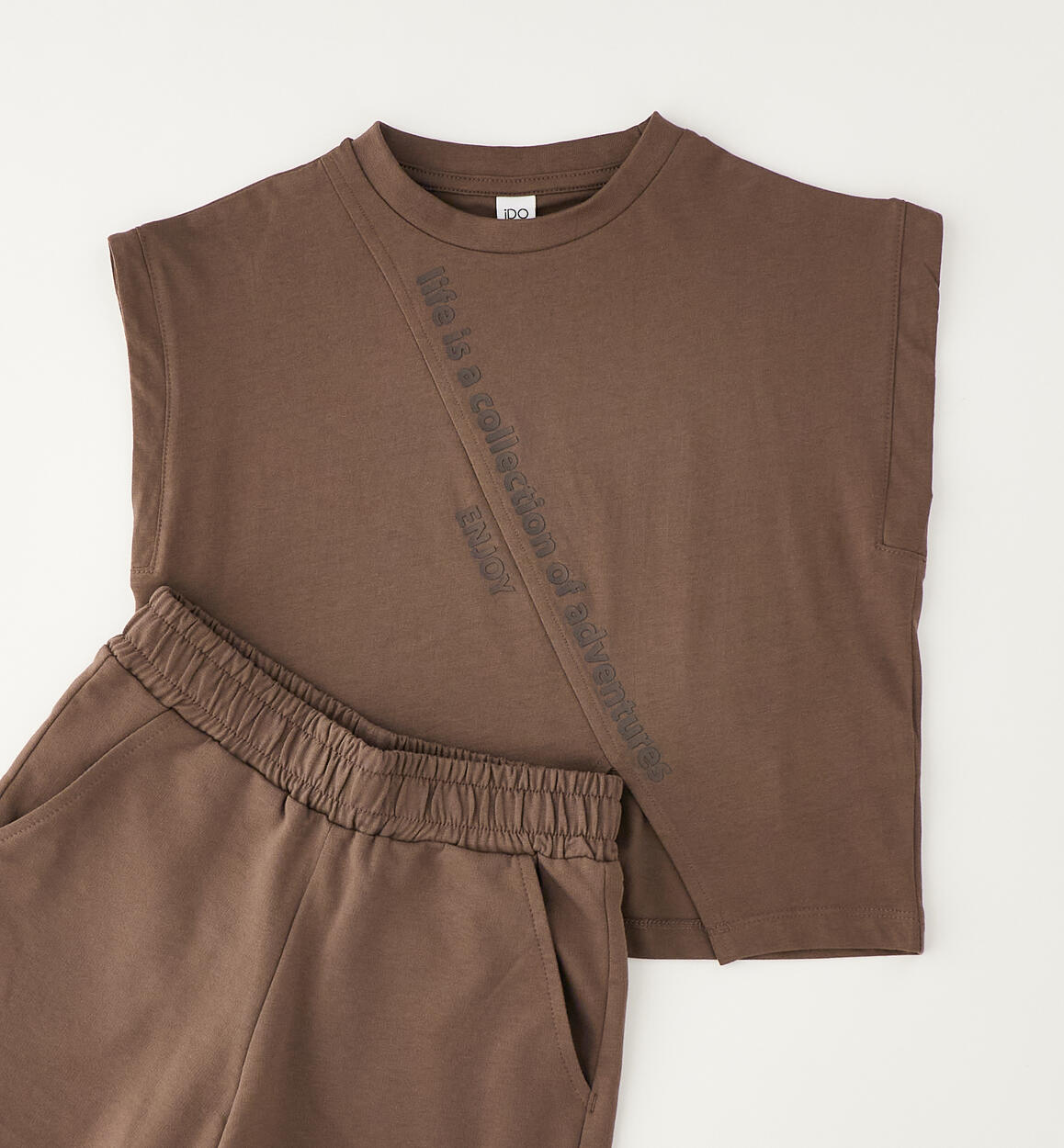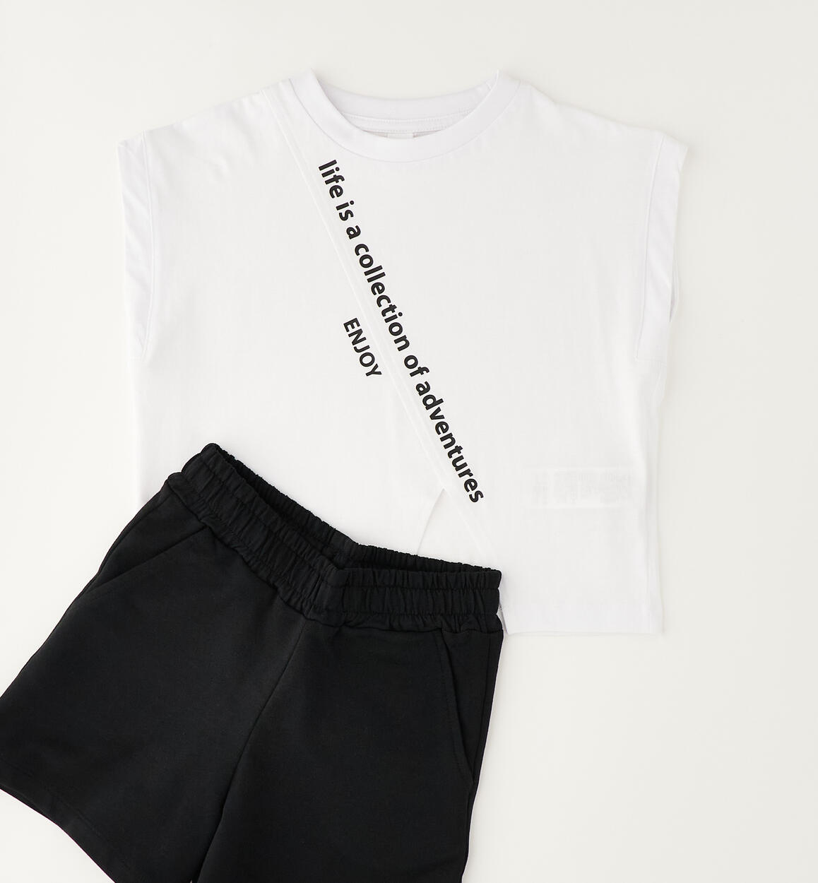 Completo estivo per ragazza iDO realizzato in 100% cotone. Comoda t-shirt in jersey di cotone con stampa e spacco davanti. Pantalone corto in felpa 100% cotone con elastico in vita e coulisse