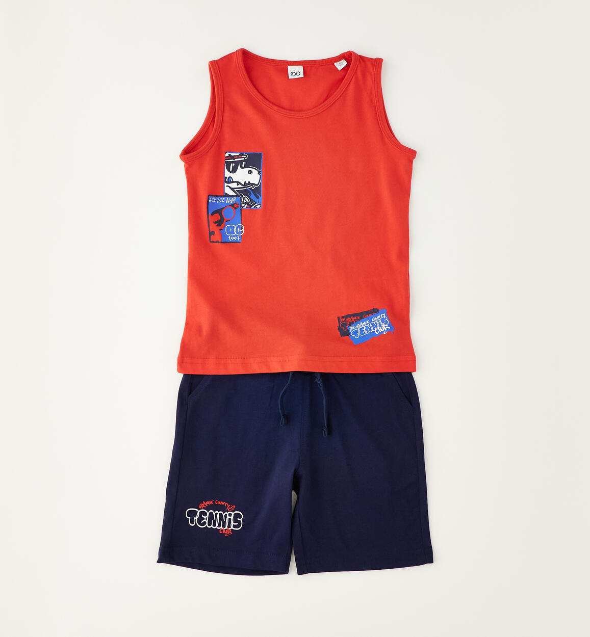 Completo con canotta per bambino iDO realizzato in jersey 100% cotone, tema tennis. Canotta con stampa. Pantaloncino con elastico in vita e coulisse, stampa all over, lunghezza al ginocchio. Scegliendo i nostri prodotti in cotone, sostieni l'impegno di iDO nella missione Better Cotton. La fornitura di questo prodotto avviene tramite un sistema di bilancio di massa e potrebbe non contenere Better Cotton. Leggi di più su bettercotton.org/massbalance