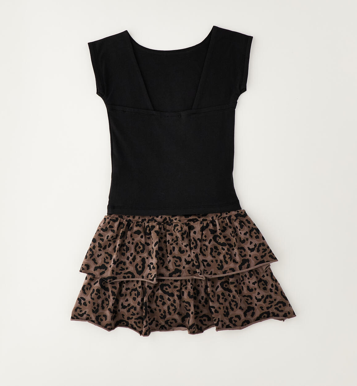 Completo a manica corta per ragazza iDO realizzato in jersey stretch di cotone. T-shirt tinta unita con scollo sulla schiena e gonna fantasia animalier con pantaloncini sotto