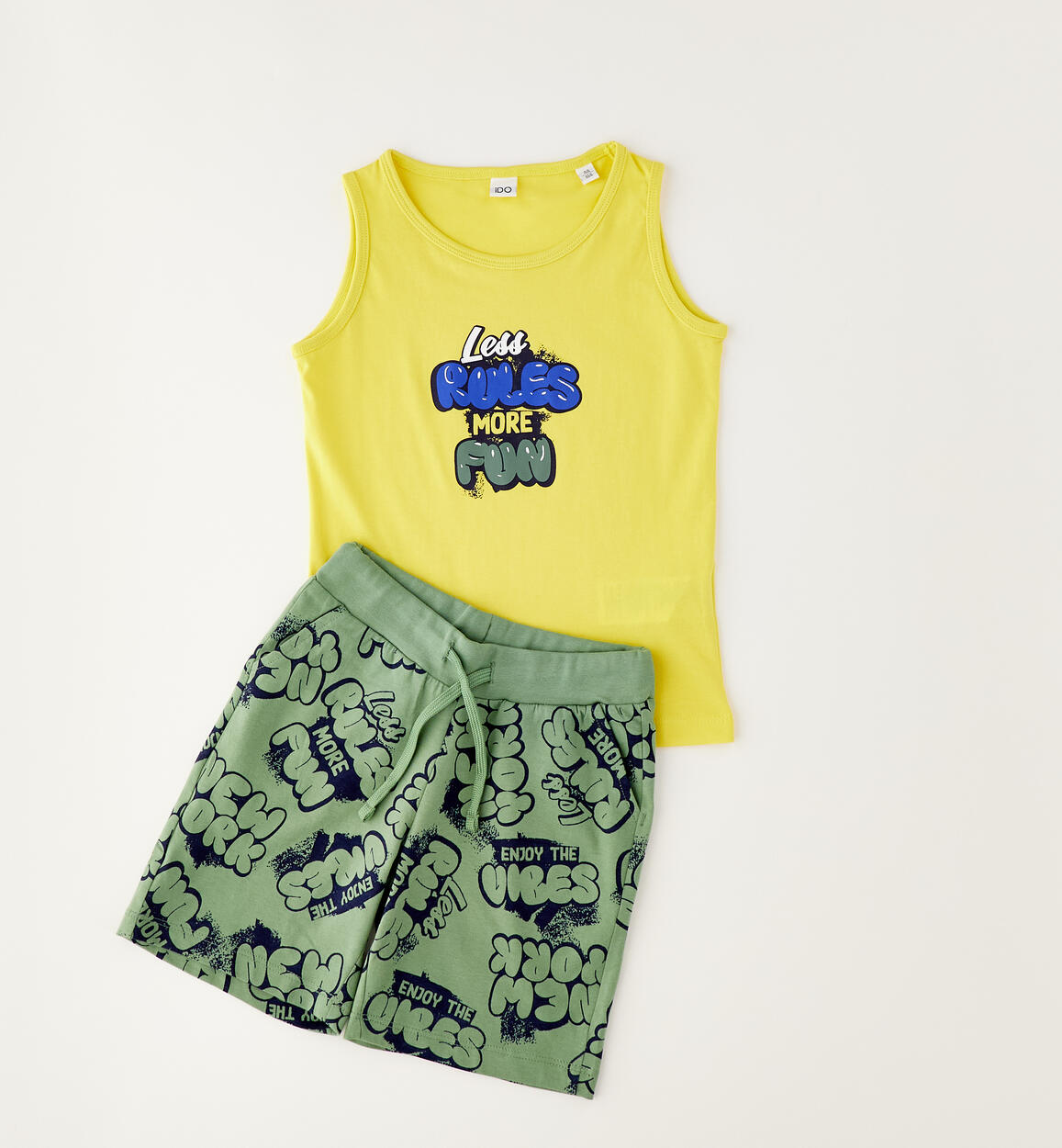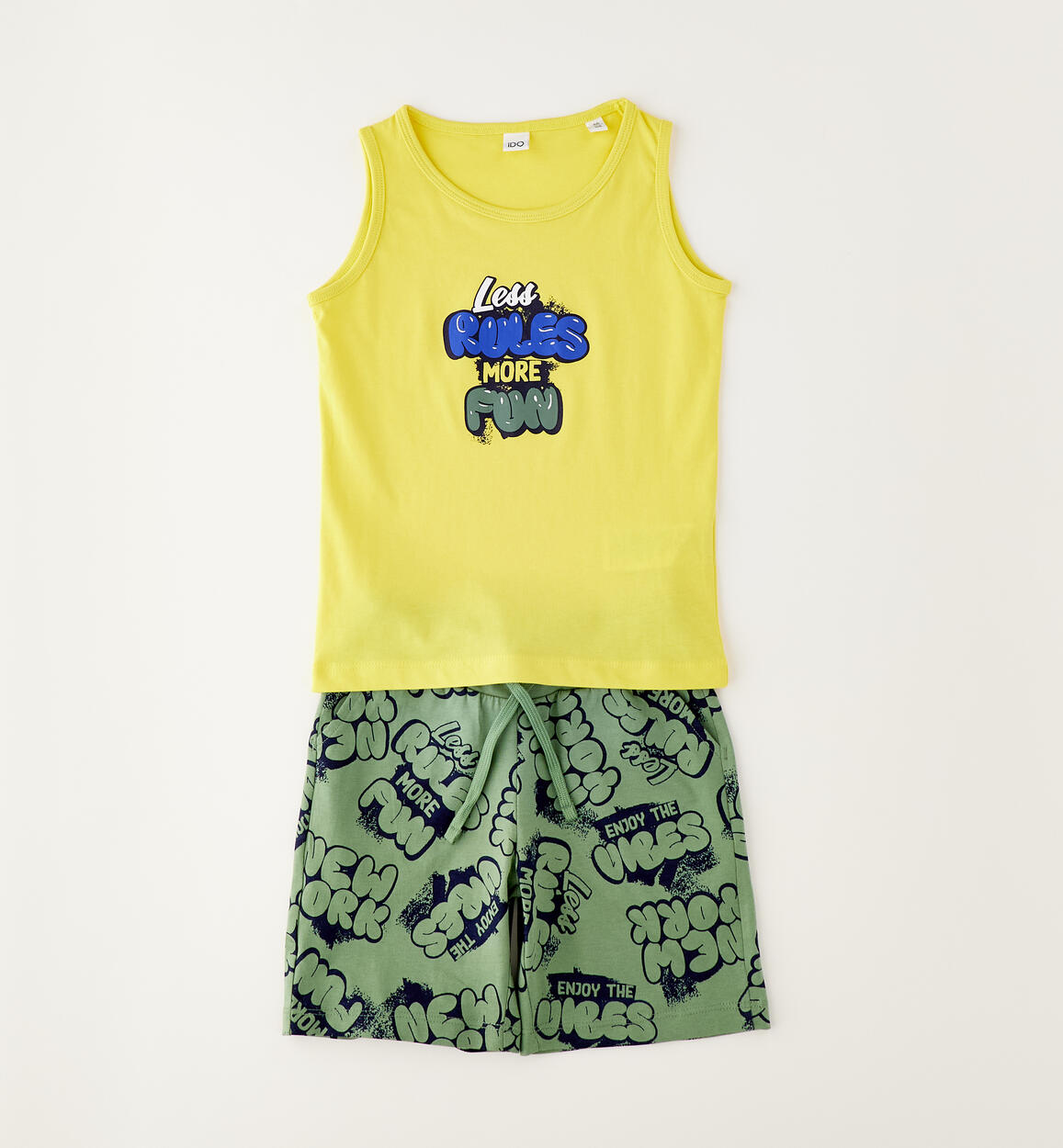 Completo con canotta per bambino iDO realizzato in jersey 100% cotone. Canotta con stampa. Pantaloncino con elastico in vita e coulisse, stampa all over, lunghezza al ginocchio. Scegliendo i nostri prodotti in cotone, sostieni l'impegno di iDO nella missione Better Cotton. La fornitura di questo prodotto avviene tramite un sistema di bilancio di massa e potrebbe non contenere Better Cotton. Leggi di più su bettercotton.org/massbalance