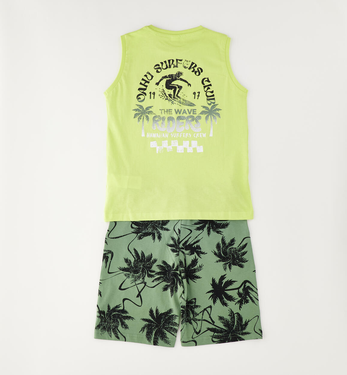 Completo estivo per ragazzo iDO realizzato in jersey 100% cotone. Canotta con stampa dietro e pantaloncino lungo al ginocchio, con stampa all over. Elastico in vita e coulisse