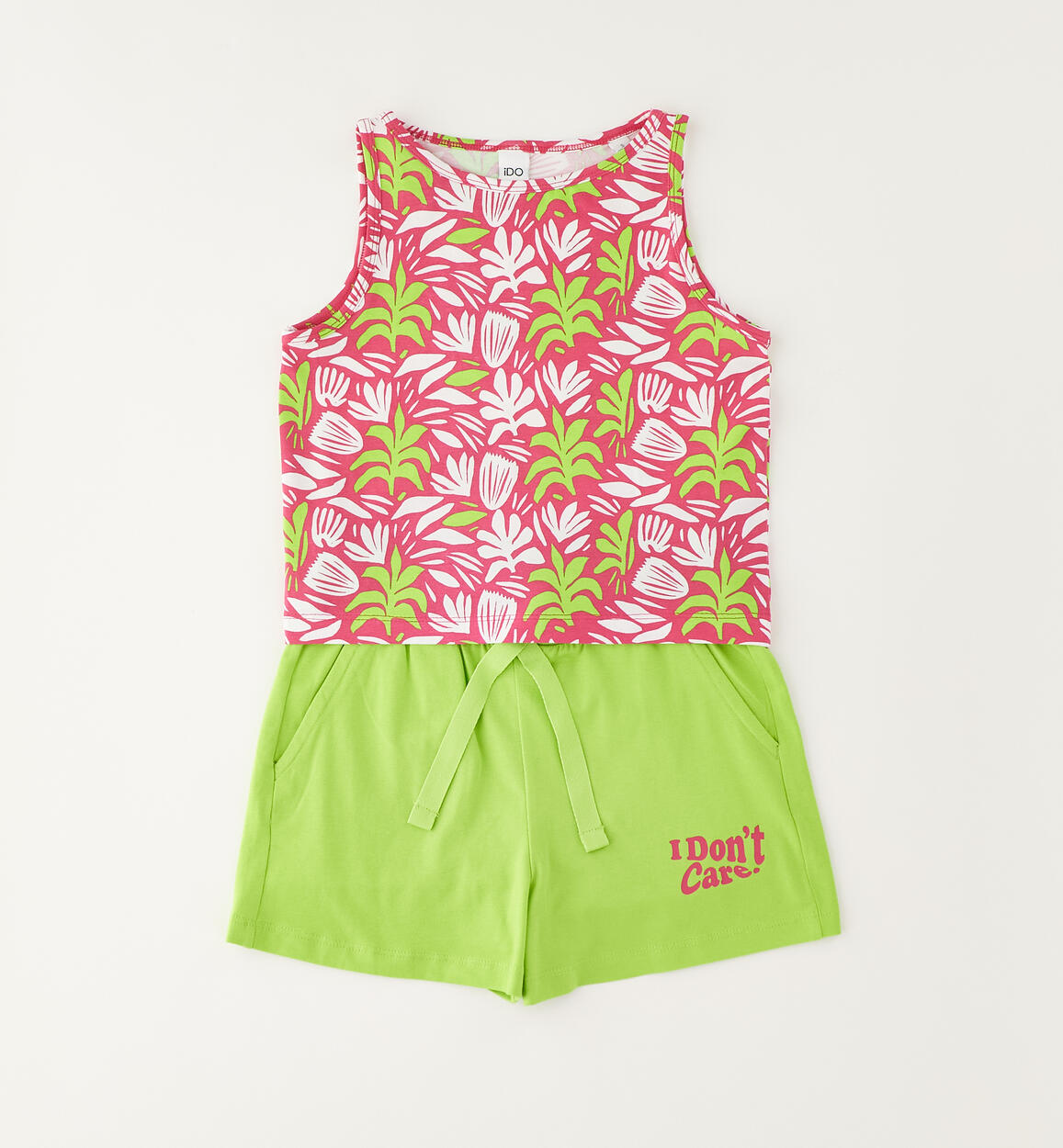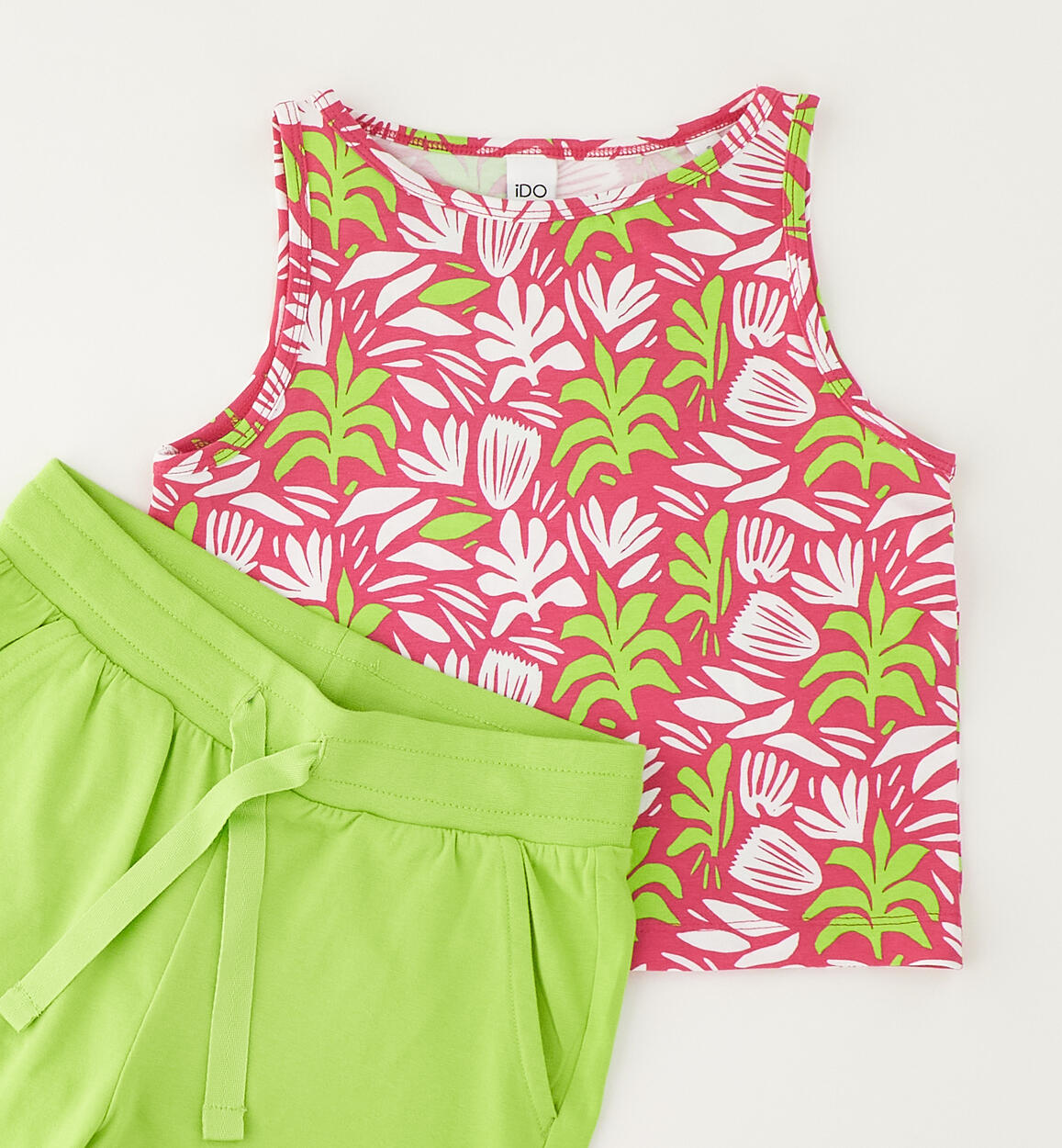 Completo estivo per ragazza iDO realizzato in jersey stretch di cotone. Canotta fantasia all over e pantaloncino tinta unita, con tasche, elastico in vita e coulisse