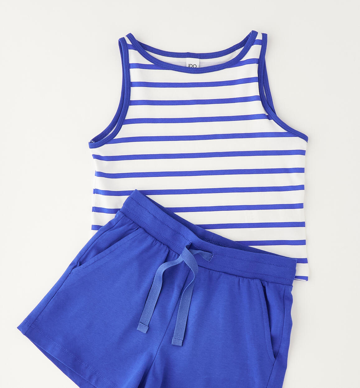 Completo estivo per ragazza iDO realizzato in jersey stretch di cotone. Canotta a righe e pantaloncino tinta unita, con tasche, elastico in vita e coulisse