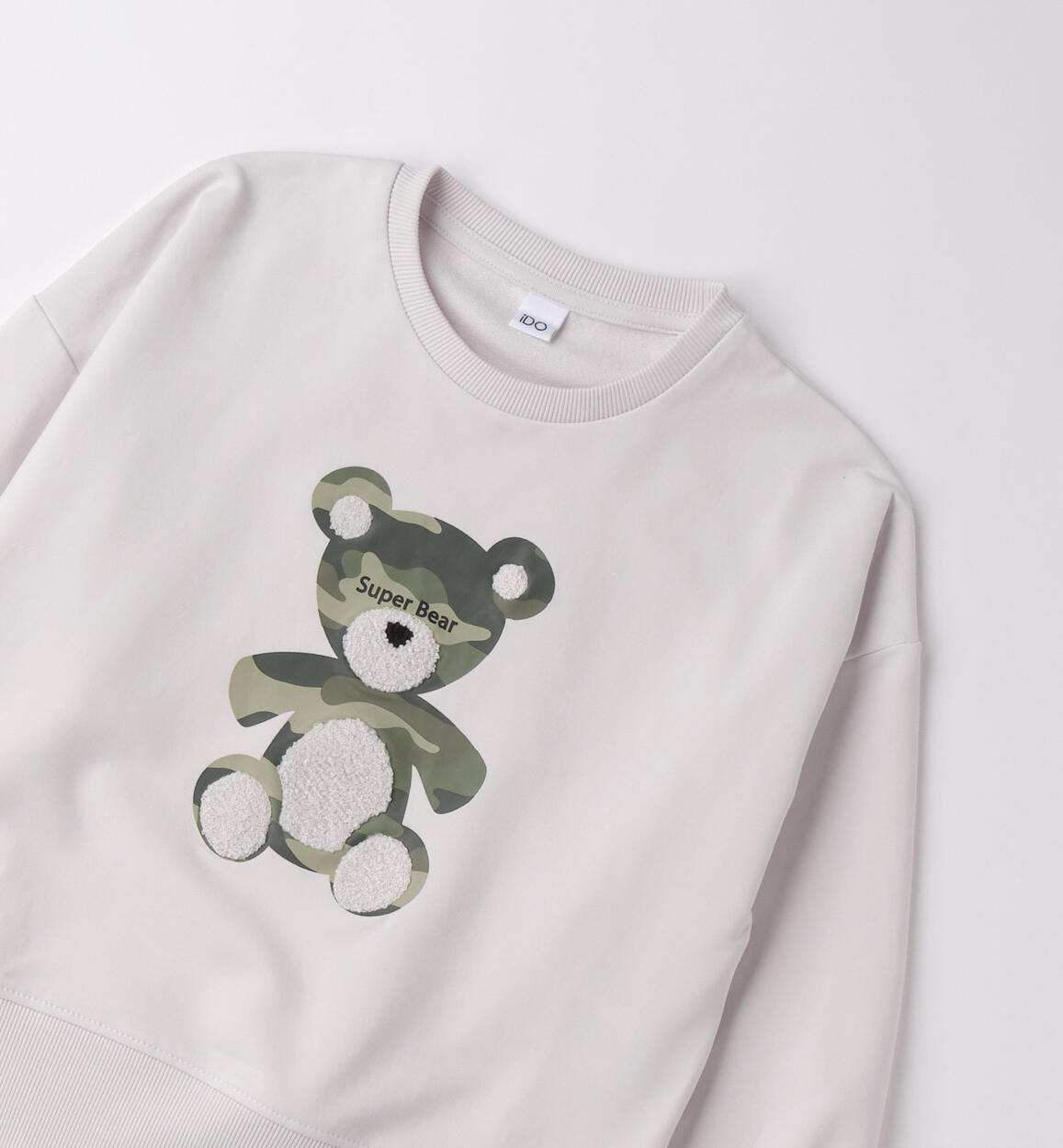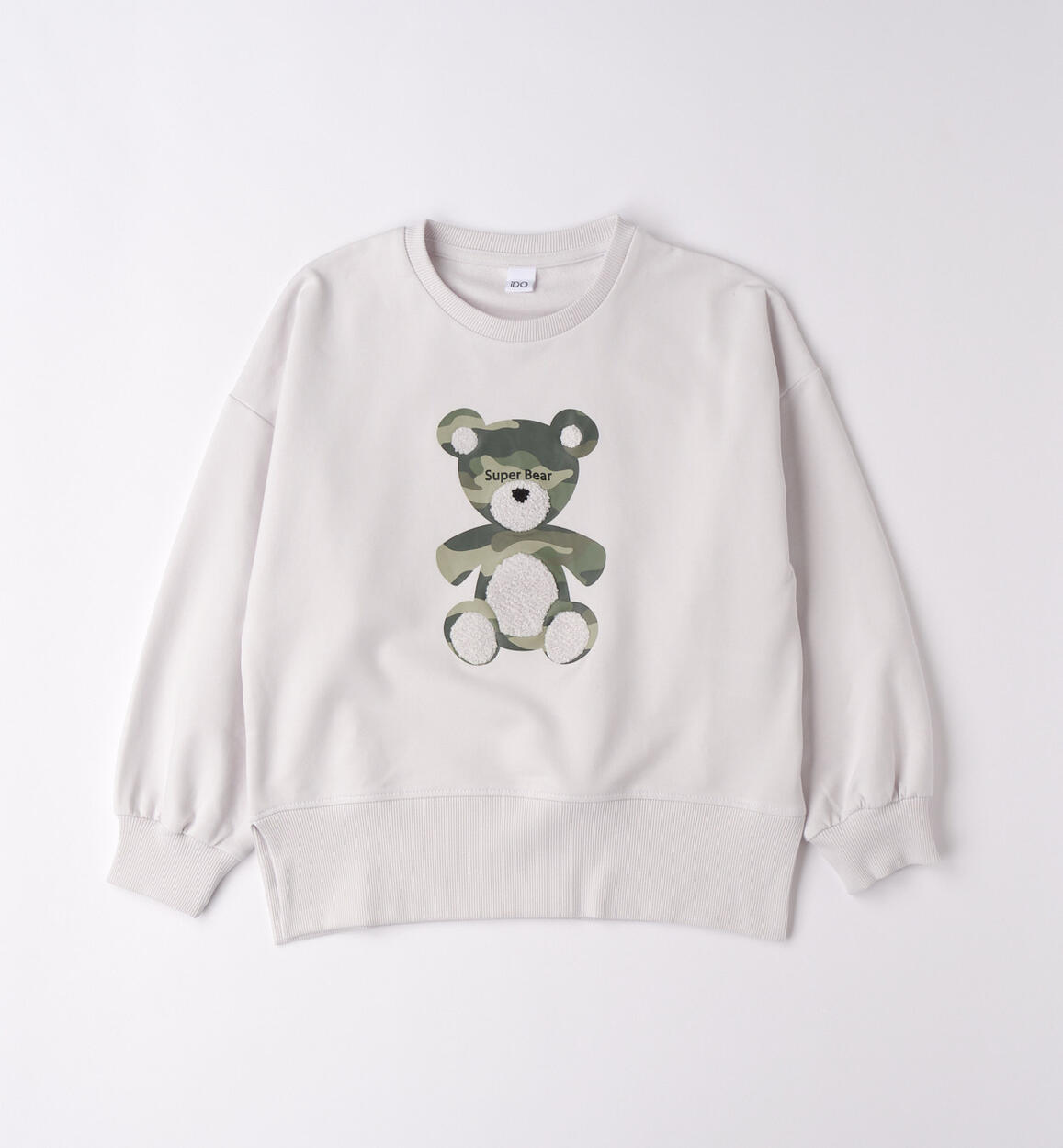 Felpa per ragazza iDO realizzata in french terry stretch di cotone. Modello over con spacchi laterali. Stampa orso camouflage con dettagli in spugna