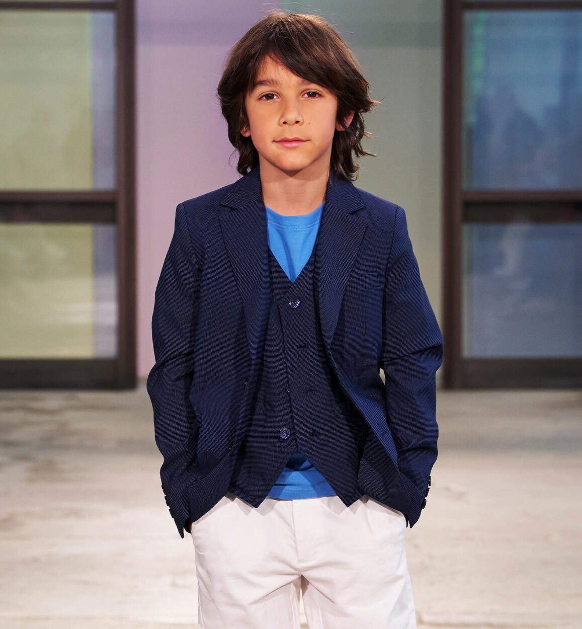 Elegante giacca per ragazzo iDO realizzata in tessuto con micro stampa. Modello con tasche e collo revers. Apertura con bottoni