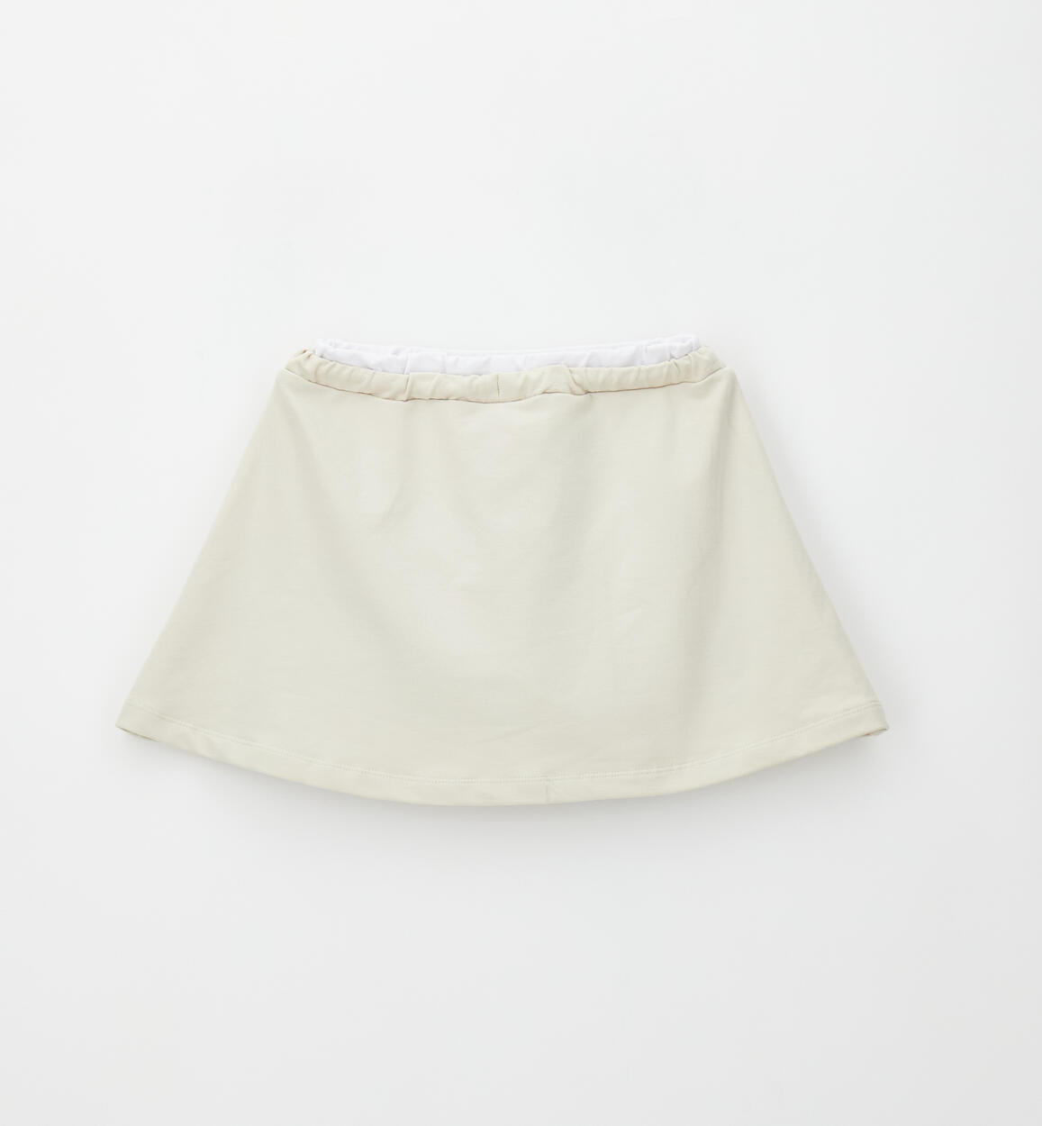 Gonna in felpa stretch di cotone per ragazza iDO con elastico in vita bicolor con coulisse. Lunghezza mini. Pantaloncino corto sotto in jersey stretch di cotone