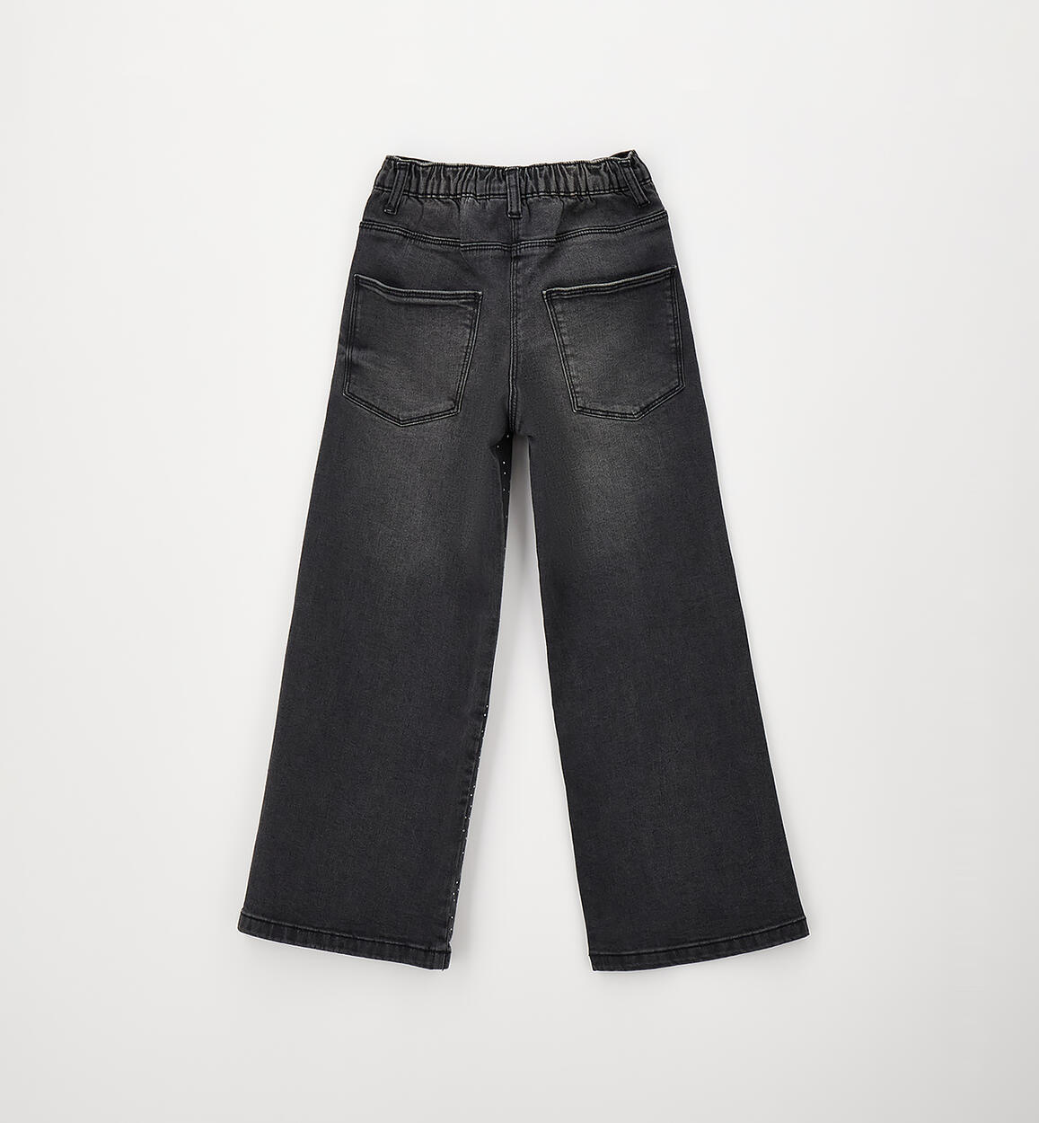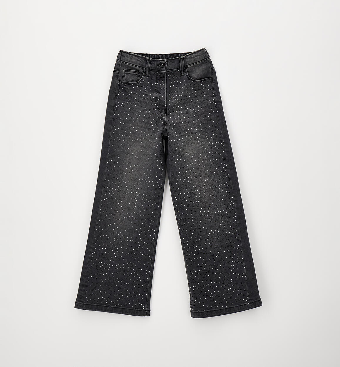 Pantalone lungo in denim di cotone stretch per ragazza iDO illuminato da strass. Apertura con zip e bottone. Vita regolabile con elastico asolato interno. Wide fit