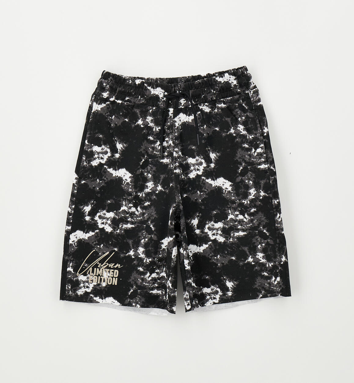 Pantalone corto in felpa 100% cotone per ragazzo iDO. Elastico in vita e coulisse. Modello basket, vestibilità over, fantasia all over. Fondo gamba a taglio vivo