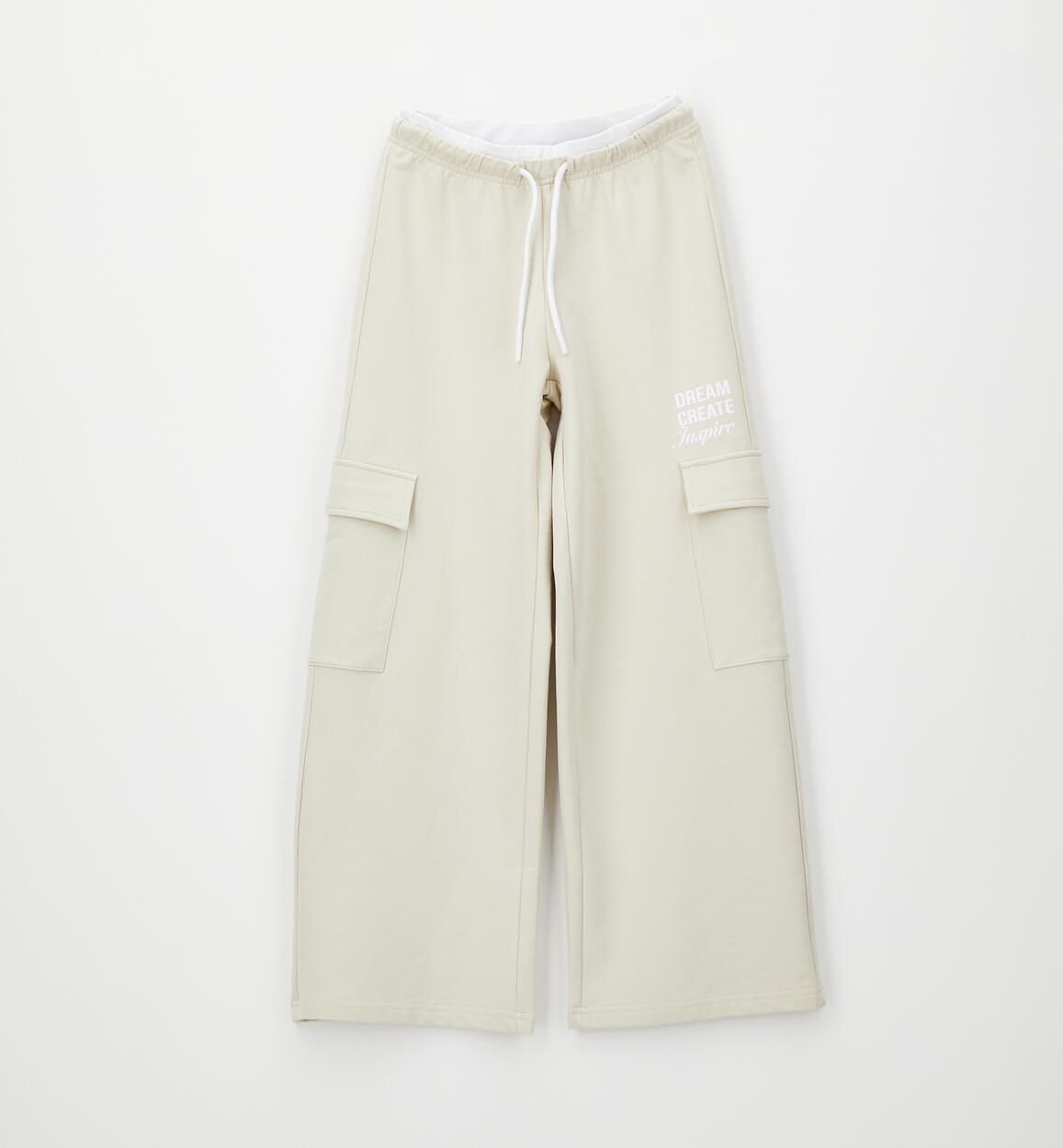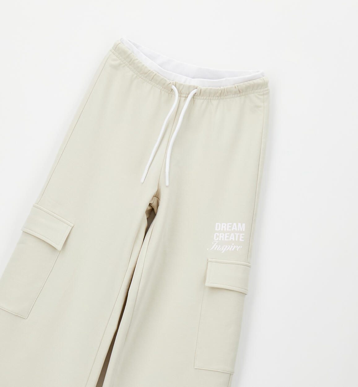 Pantalone lungo per ragazza iDO realizzato in felpa stretch di cotone con elastico bicolor in vita e coulisse. Modello ampio con tasconi laterali. Cargo wide fit