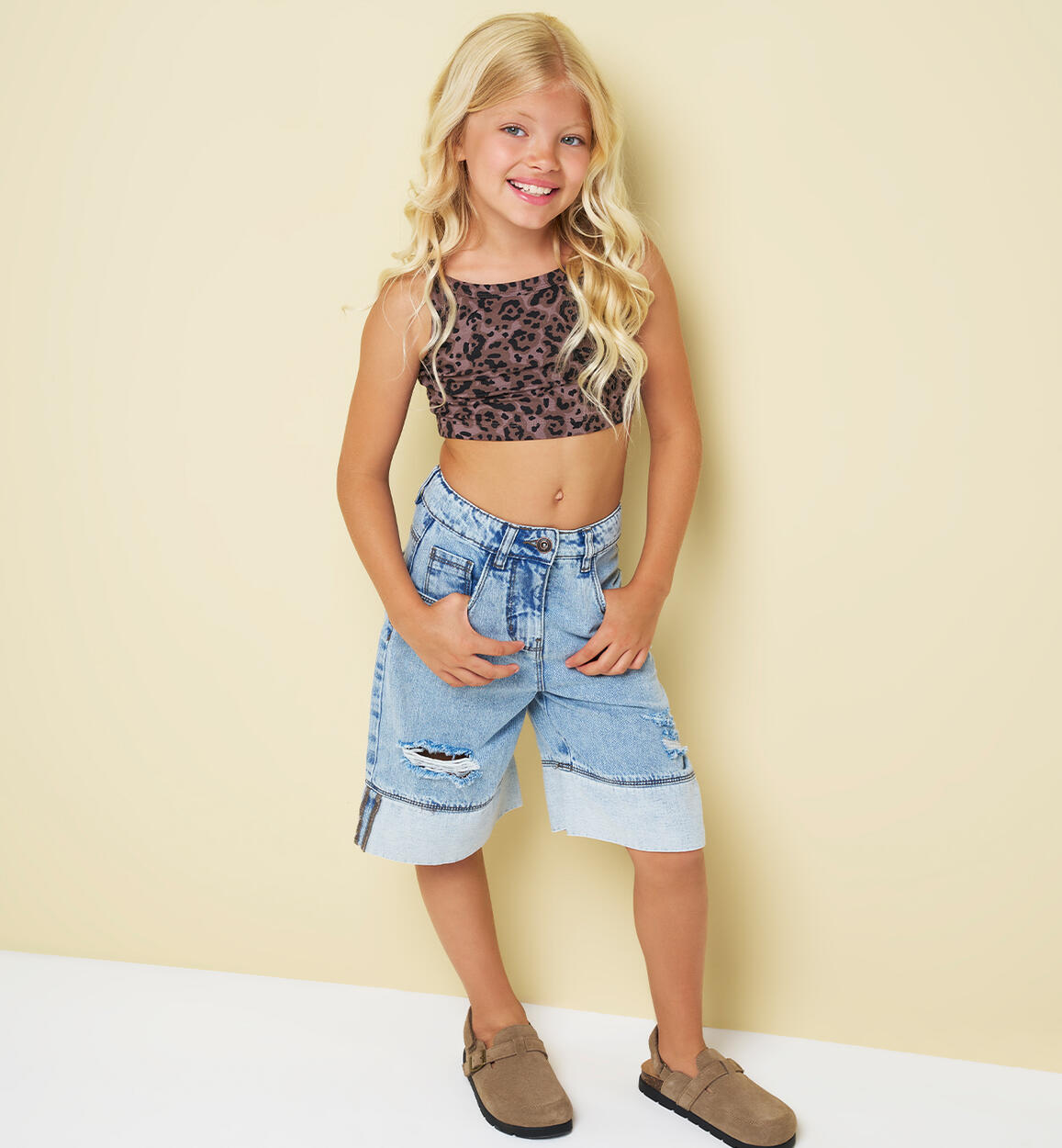 Pantalone corto in morbido denim 100% cotone per ragazza iDO. Modello a vita alta, arricchito da rotture e particolare fondo gamba. Apertura con zip e bottone. Vita regolabile con elastico asolato interno