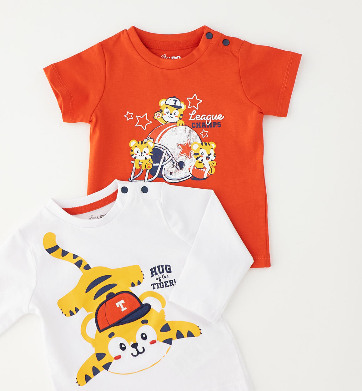 Kit due magliette iDO per bimbo realizzate in jersey 100% cotone. Un modello è a manica corta con stampa davanti. L'altro modello è a manica lunga con stampa e ricami. Apertura sulla spalla con bottoni a pressione. Scegliendo i nostri prodotti in cotone, sostieni il nostro investimento nella missione Better Cotton. La fornitura di questo prodotto avviene tramite un sistema di bilancio di massa e potrebbe non contenere Better Cotton. Leggi di più su bettercotton.org/massbalance
